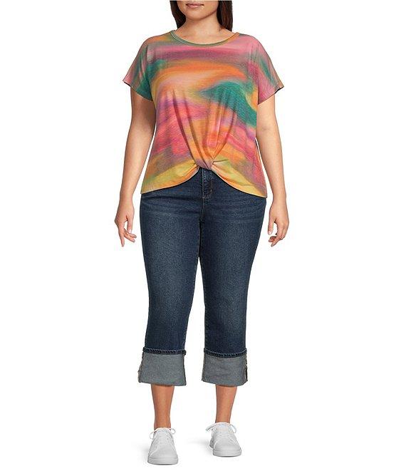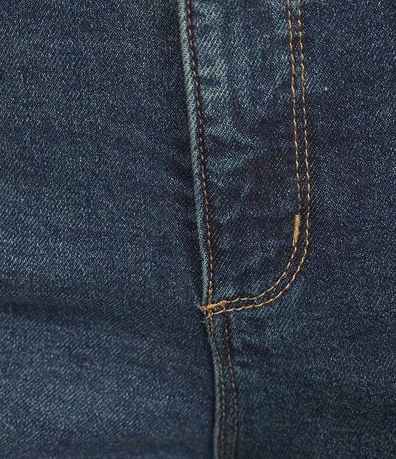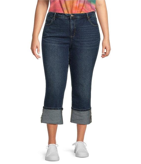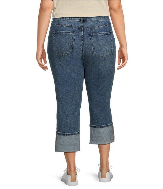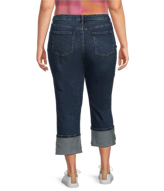 From Code Bleu Plus, these jeans feature: Stretch denim fabrication Boyfriend fit High rise waistline Belt loops 5-pocket style Cropped length Straight leg with wide cuffs Button and zip fly closure Approx. 25" inseam; 18.5" leg opening; 12.375" front rise; 18.5" back rise Cotton/spandex Machine wash/tumble dry Imported.