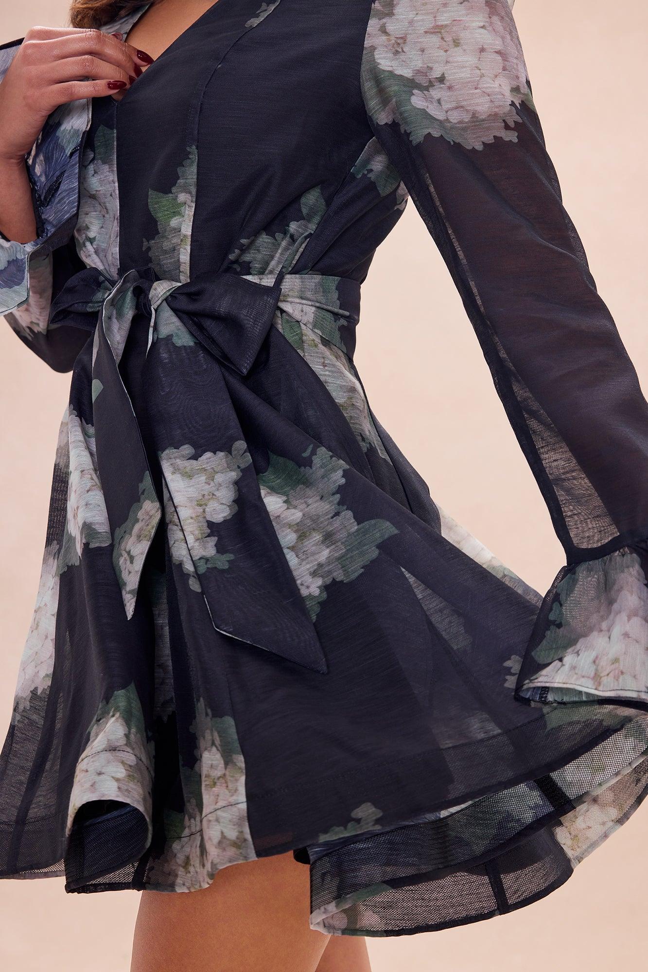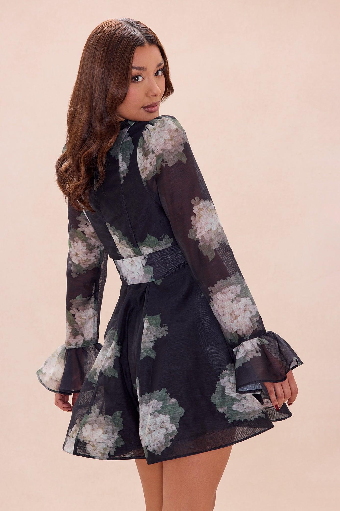 Available In Black/combo. Organza Mini Dress V-Neck Long Sleeve Ruffle Sleeve Tie Front Back Zipper Closure Lined Length Measured Flat = 33" Disclaimer: Print Placement May Vary Self: 100% Polyester Lining: 100% Polyester Imported