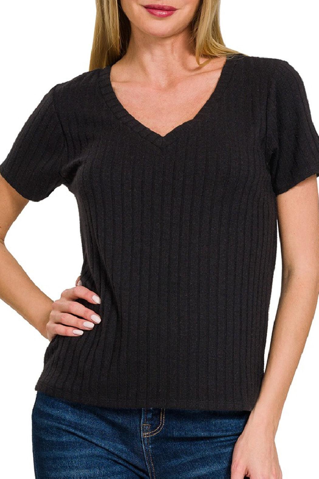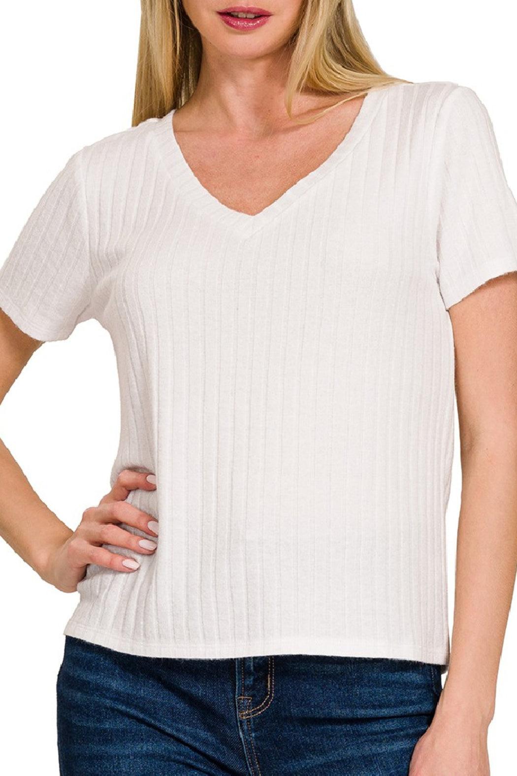 Classic, wide ribbed, v-neck short sleeve top. Soft, lightweight fabric. Model is wearing a small. Refer to measurements for your perfect fit.