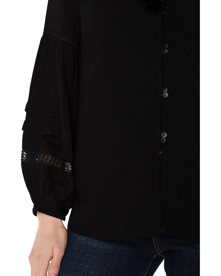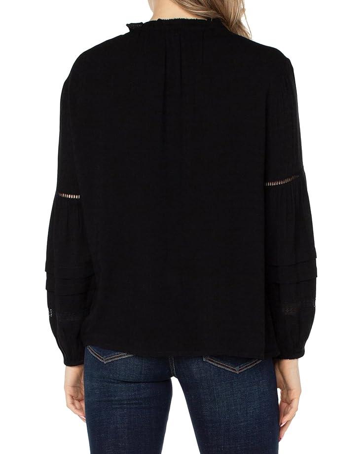 Look lovely in the relaxed breezy style of this Liverpool™ Long Sleeve Popover Shirred Blouse that is designed with a lightweight fabric to keep you comfortable all day long. This classic silhouette is accented with a shirred back panel and a flattering v-neckline with ruffled collar and self-tie detail for a timeless look.