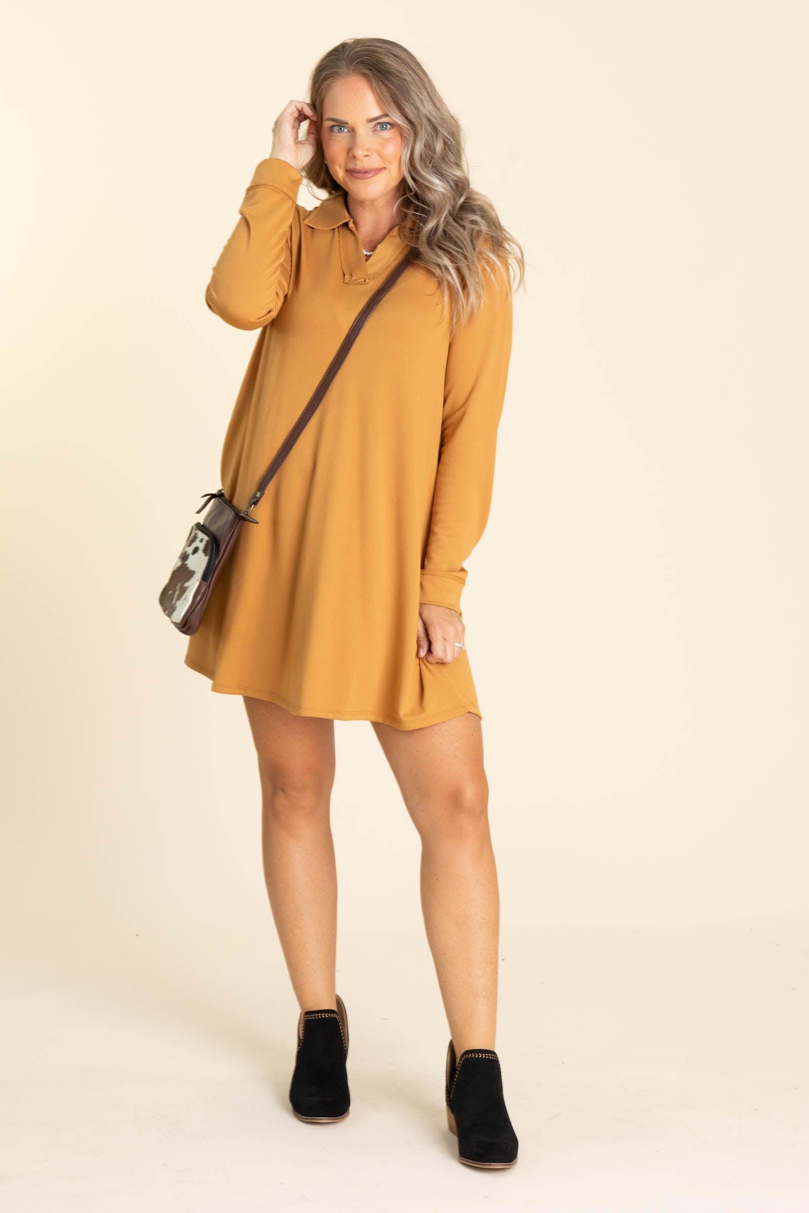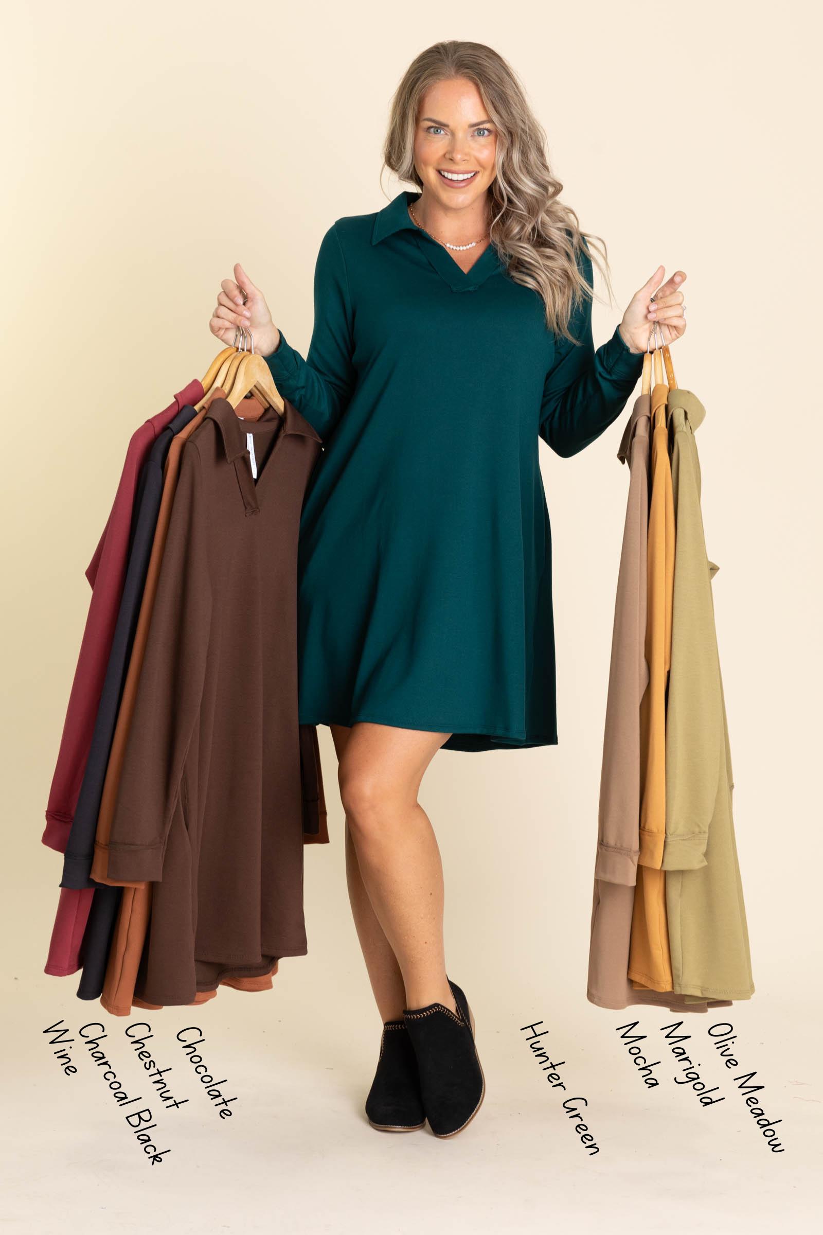 Product Details Colors: Chocolate/ Dark Mocha/ Marigold/ Olive Meadow/ Hunter Green/ Wine/ Charcoal Black/ Chestnut Print: Solid Neckline: V-Neck Sleeve: Long Sleeve Hemline: Straight Brand: Dear Scarlett Material and Care 70% Polyester 26% Rayon 4% Spandex Hand Wash Cold Hang/ Line Dry Size and Fit Small: Bust 38" Waist 40" Length 34" Medium: Bust 40" Waist 42" Length 34.5" Large: Bust 42" Waist 44" Length 35" X Large: Bust 44" Waist 46" Length 36" 2X Large: Bust 48" Waist 50" Length 36.5" 3X Large: Bust 50" Waist 52" Length 37" Erica is 5’7” and wearing her true size small Kristen is 5'2 and wearing her true size X Large