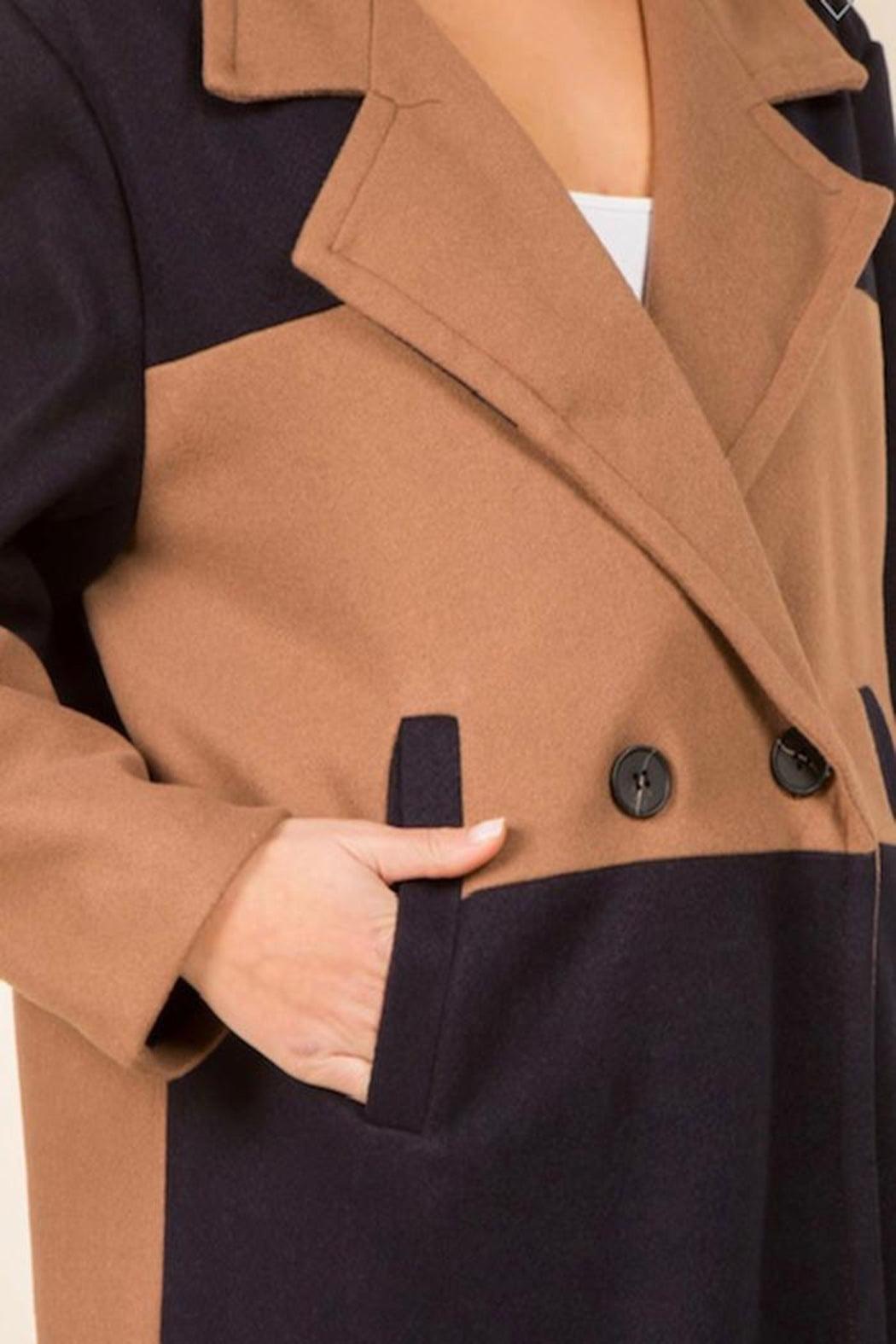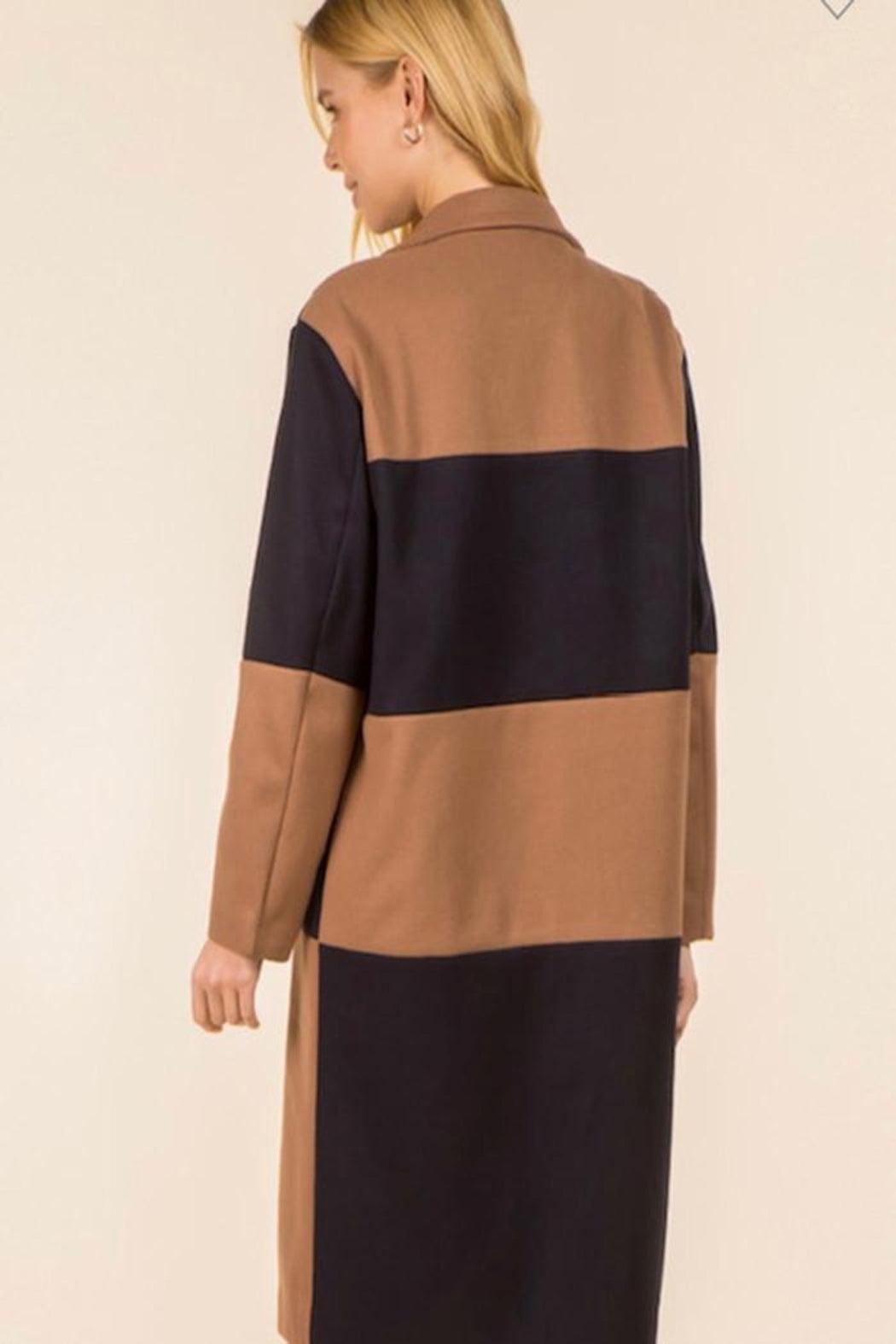 Brown and black color block long coat, fully lined and is running a bit oversized so please size down one or two sizes.