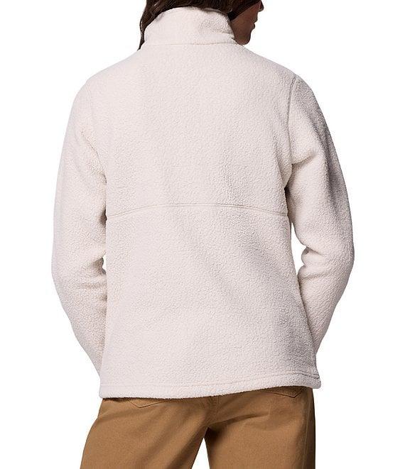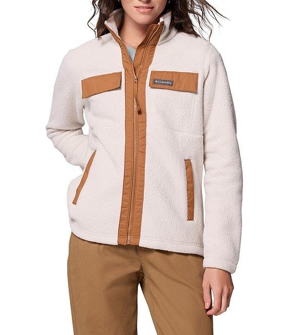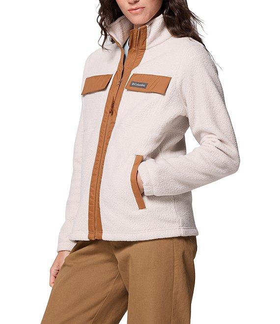 From Columbia, this jacket features: Fleece fabrication Field jacket silhouette Mock neckline Long sleeves with elastic cuffs Two chest pockets with hook and loop closure Side seam pockets with snap closure Locker loop Standard fit Drawcord adjustable hemline Zip front closure Approx. 25" length Nylon/recycled polyester Machine wash Imported.