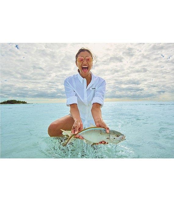 From Columbia, this top features: Woven fabrication Point collar neckline Roll-up sleeves Zippered pocket Breathable vents Omni shade UPF 40 Omni-wick Shirttail hemline Button front closure Approx. 26" length Polyester Machine wash/line dry Imported.
