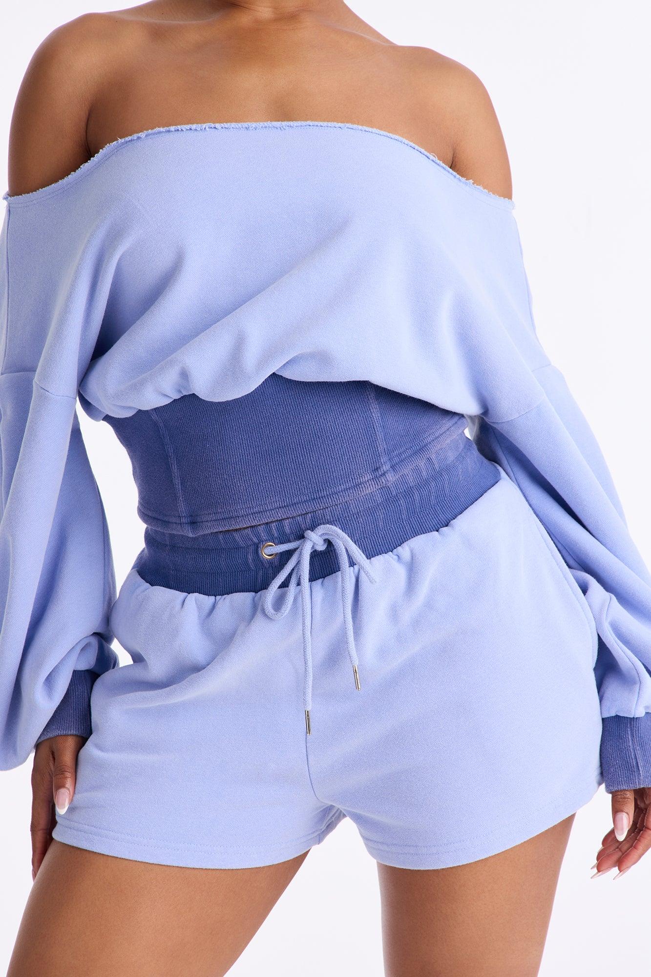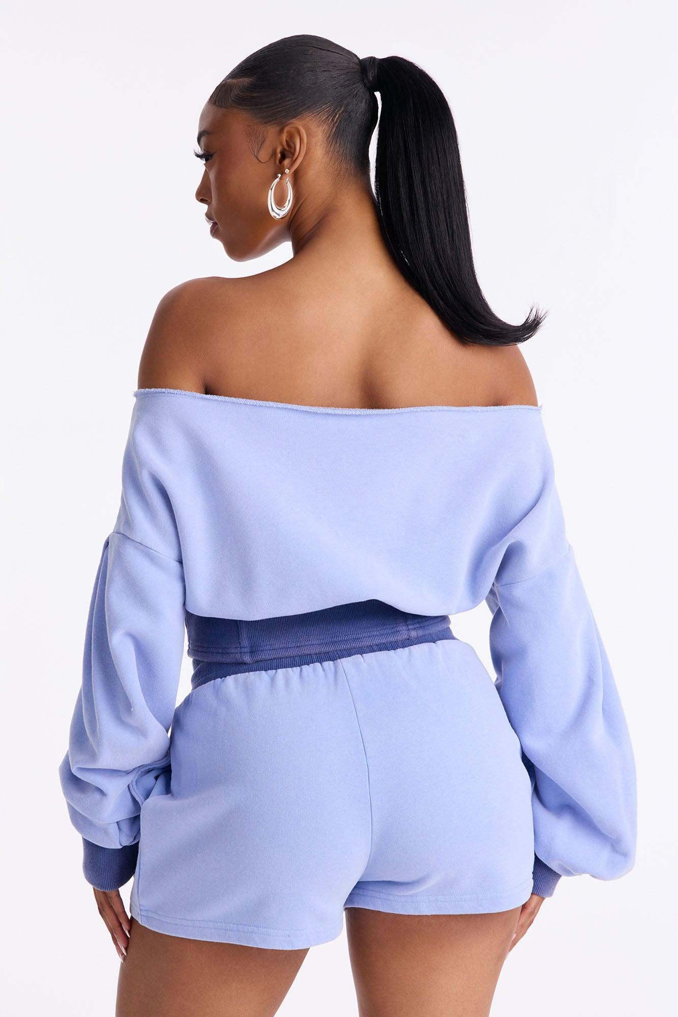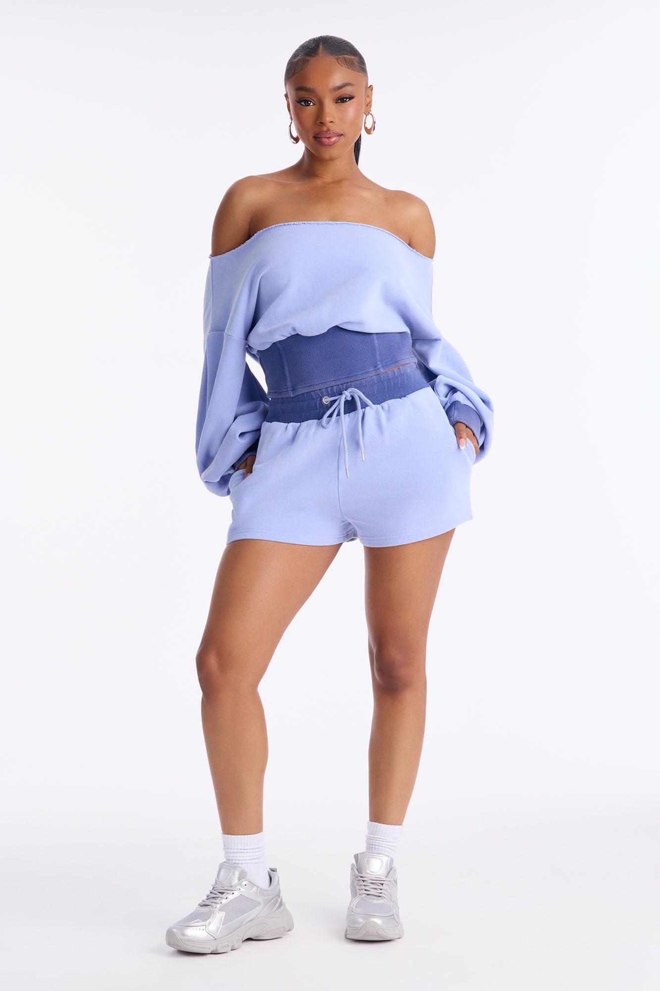 Available In Charcoal, Periwinkle, Pink And Taupe. 2 Piece Ensemble Off Shoulder Sweater And Short Set Slight Stretch Elastic Drawstring Waistband Pockets Disclaimer: Due To The Specialized Wash Process, Each Garment Is Unique. Self: 85% Cotton 15% Polyester Contrast: 58% Cotton 37% Polyester 5% Spandex Imported