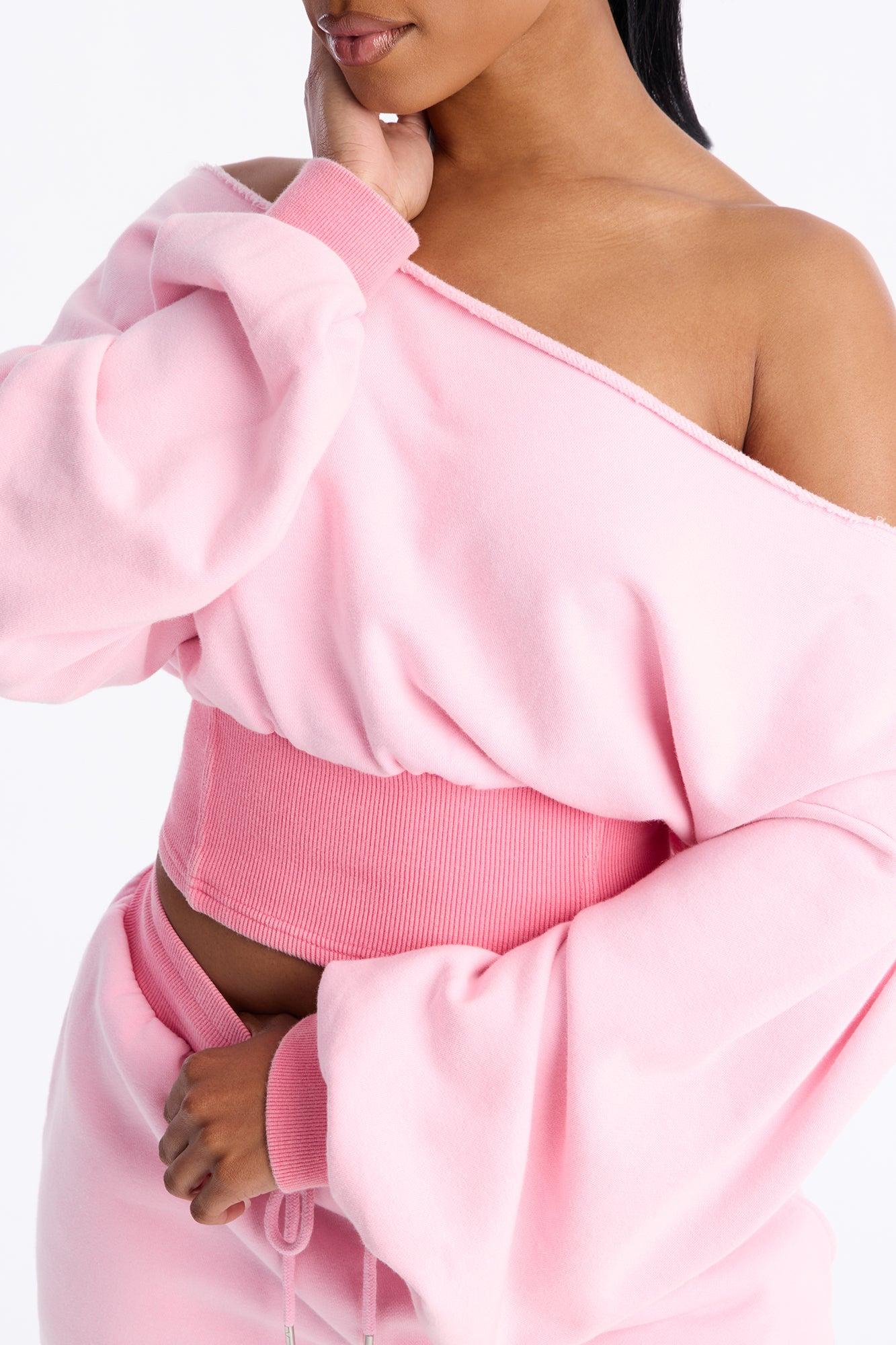 Available In Charcoal, Periwinkle, Pink And Taupe. 2 Piece Ensemble Off Shoulder Sweater And Short Set Slight Stretch Elastic Drawstring Waistband Pockets Self: 85% Cotton 15% Polyester Contrast: 58% Cotton 37% Polyester 5% Spandex Imported