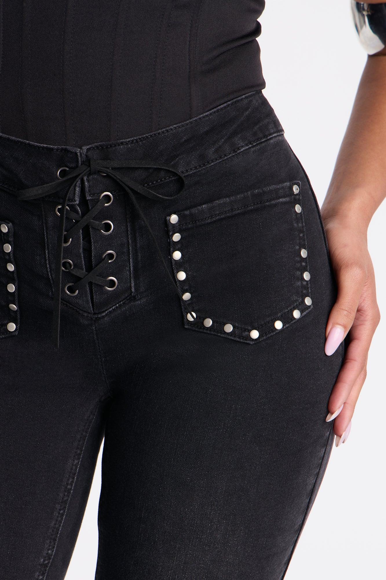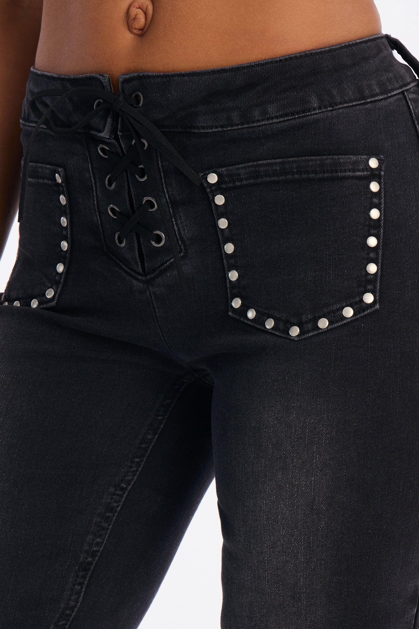 Available In Black Wash. Bootcut Jeans Front Embellished Pockets Lace Up 8.5" Rise 34" Inseam Medium Stretch Disclaimer: Due To The Specialized Wash Process, Each Garment Is Unique. Self : 77% Cotton 20% Polyester 2% Viscose 1% Spandex Imported