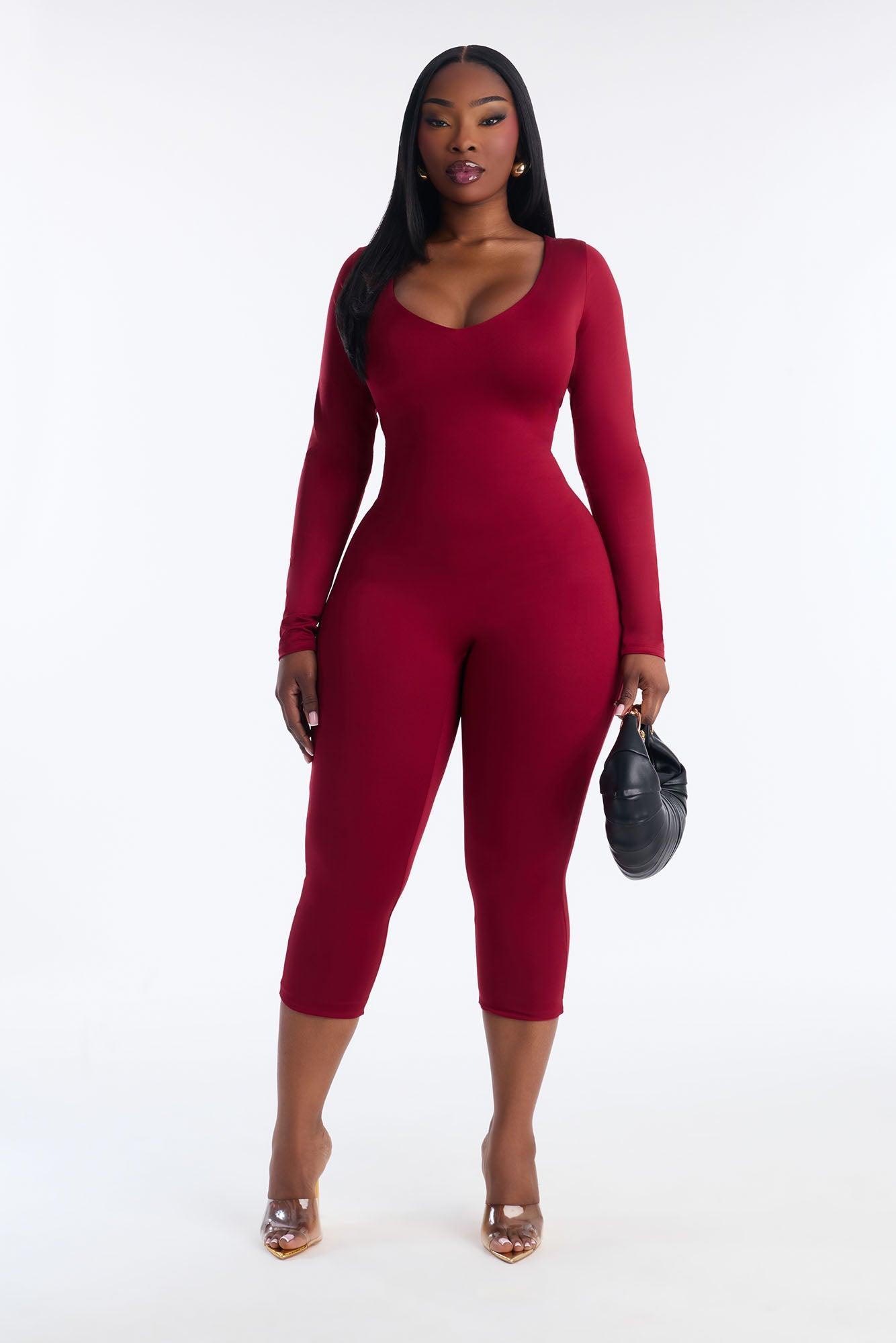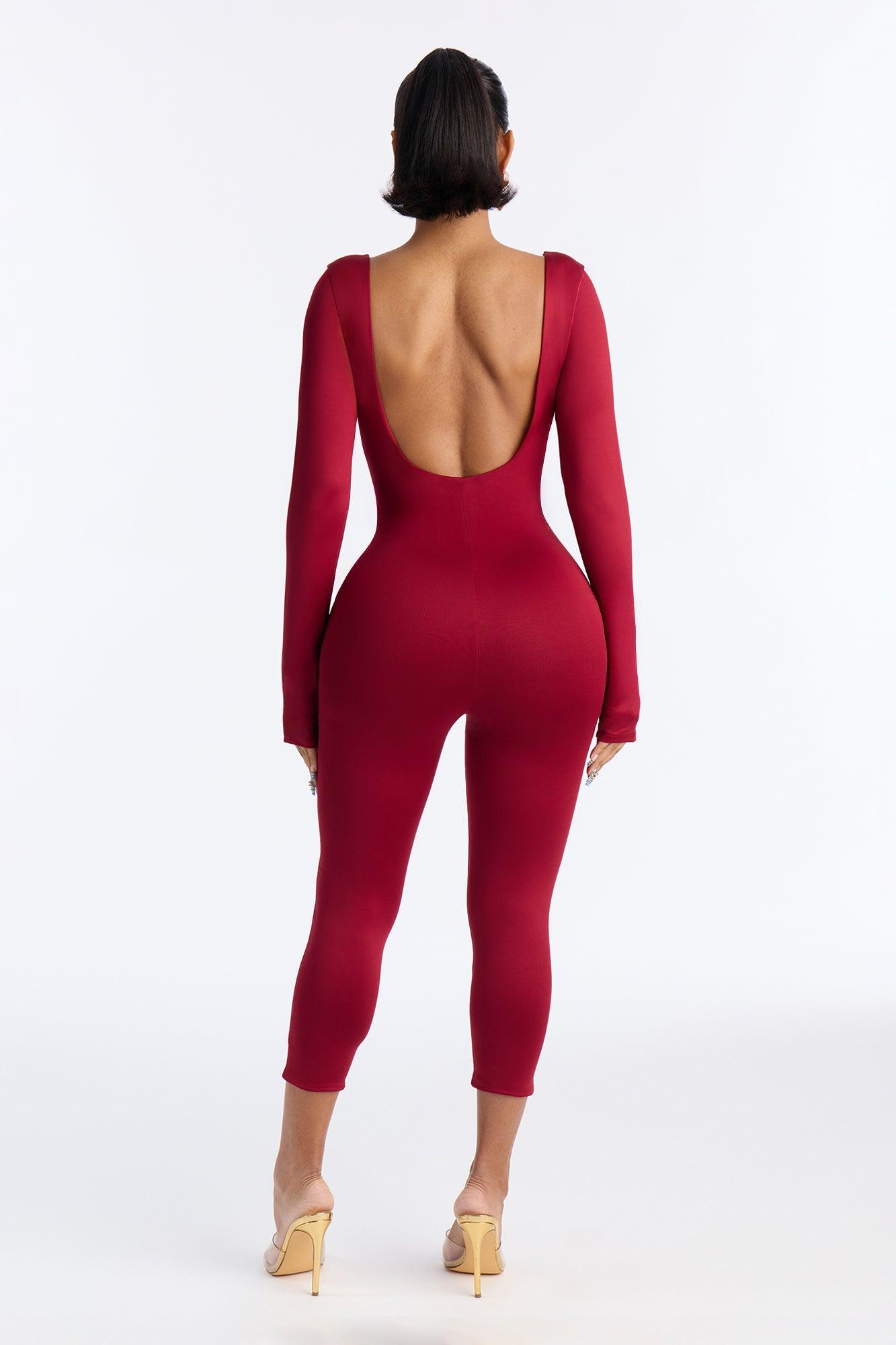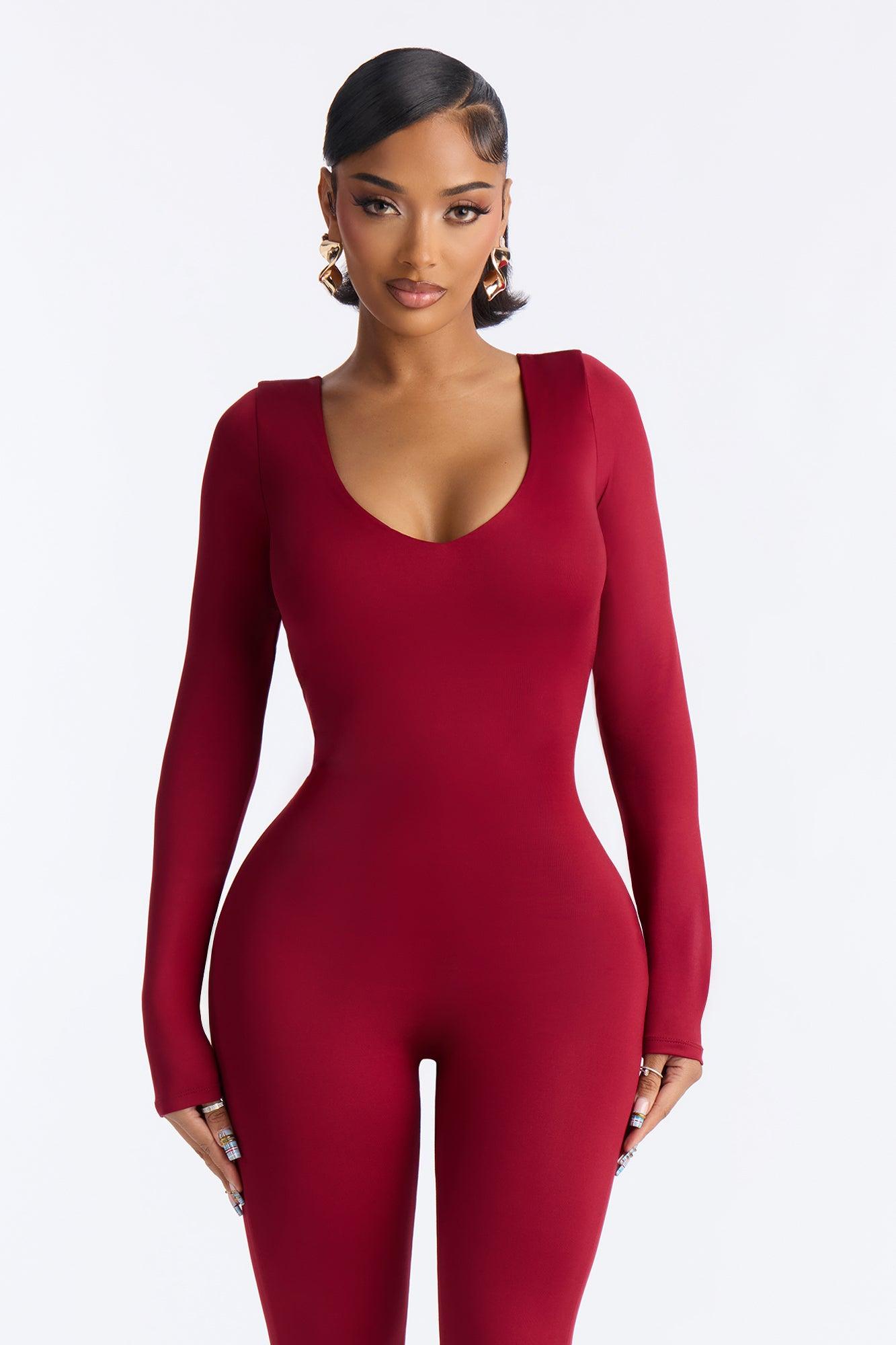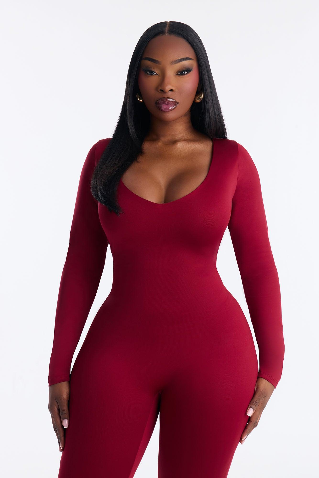 Available In Black And DarkRed. Contour Double Lined Jumpsuit Scoop Neck Long Sleeve Low Back Detail Smoothing And Shaping Stretch Self: 90% Nylon 10% Spandex Lining: 90% Nylon 10% Spandex Imported