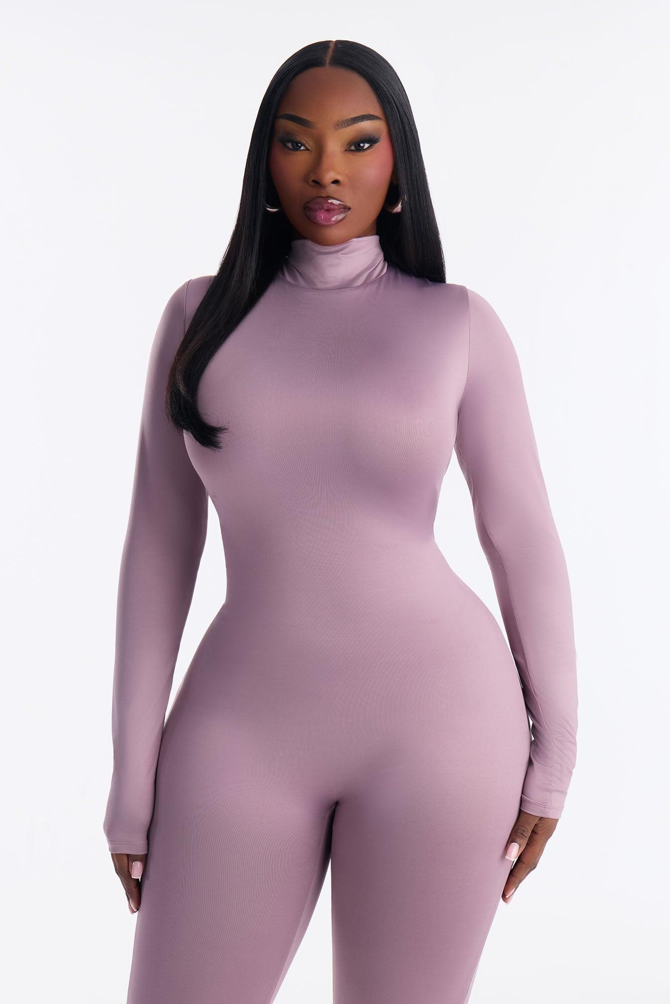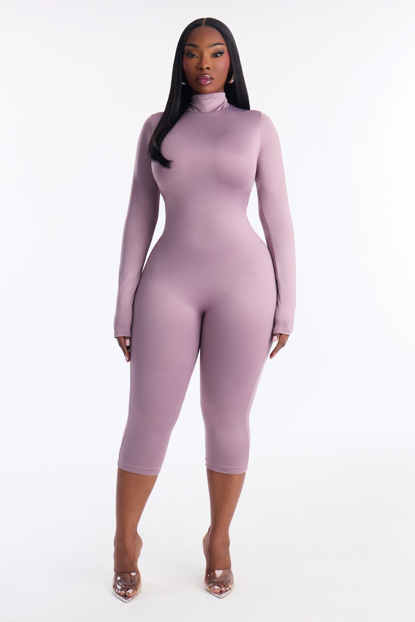 Available In Black And Lavender. Contour Double Lined Capri Jumpsuit Mock Neck Long Sleeve Smoothing And Shaping Stretch Self: 90% Nylon 10% Spandex Lining: 90% Nylon 10% Spandex Imported California Proposition 65WARNING: Cancer and Reproductive Harm - www.P65Warnings.ca.gov.