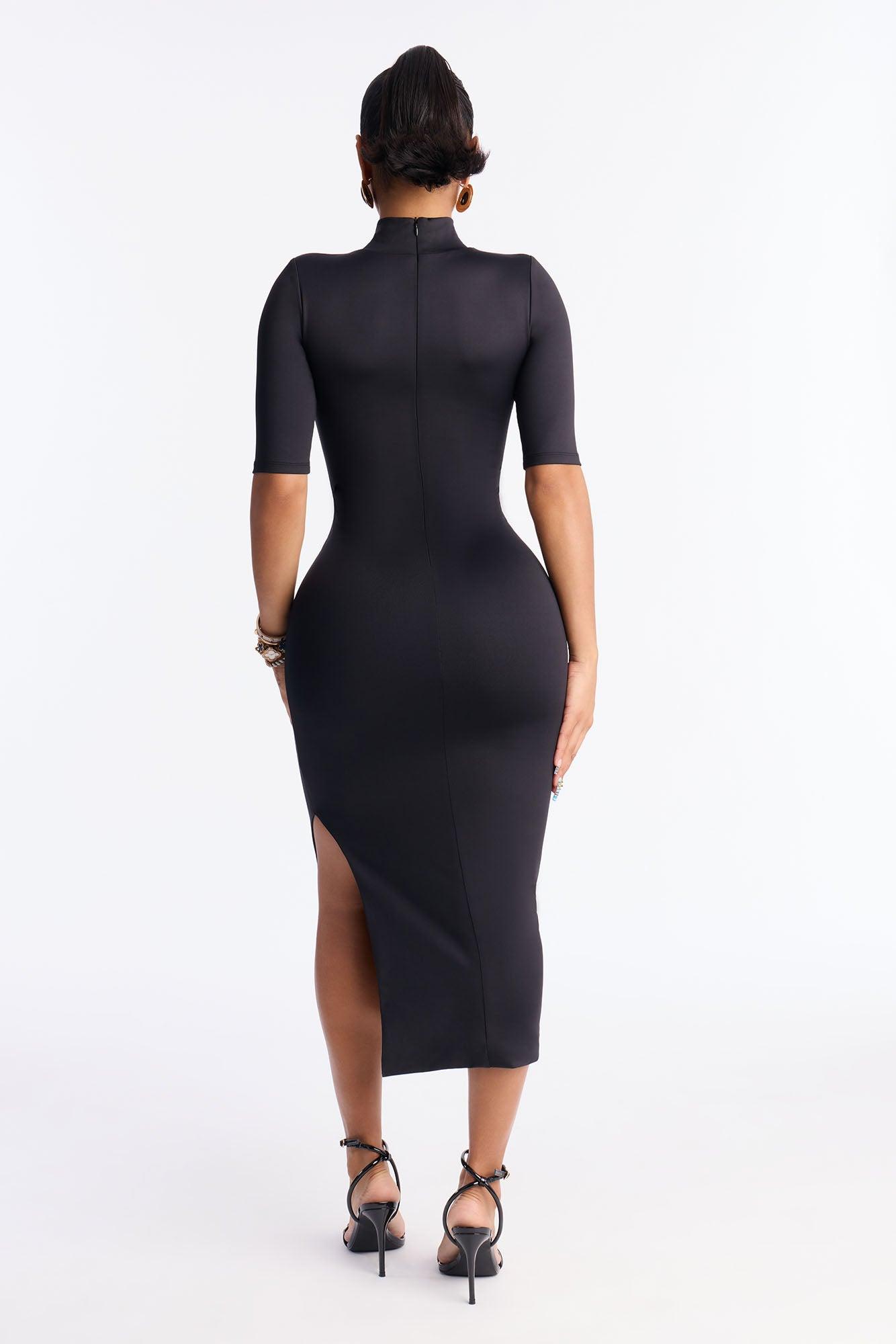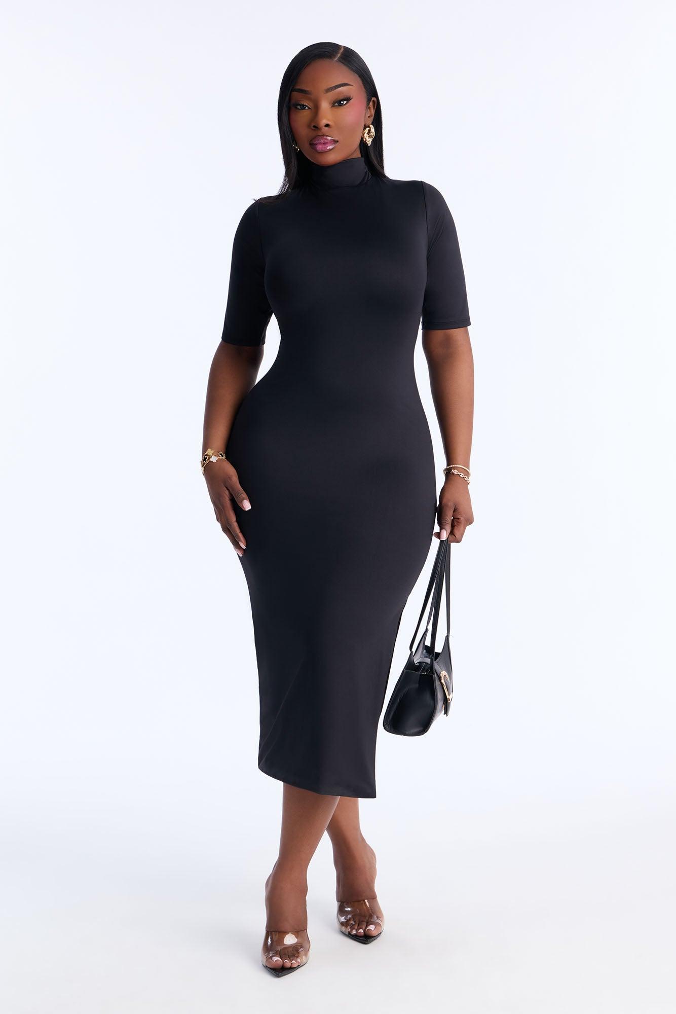 Available In Black And Lavender. Contour Double Lined Midi Dress Turtle Neck Short Sleeve Smoothing And Shaping Stretch Self: 90% Nylon 10% Spandex Lining: 90% Nylon 10% Spandex Imported California Proposition 65WARNING: Cancer and Reproductive Harm - www.P65Warnings.ca.gov.