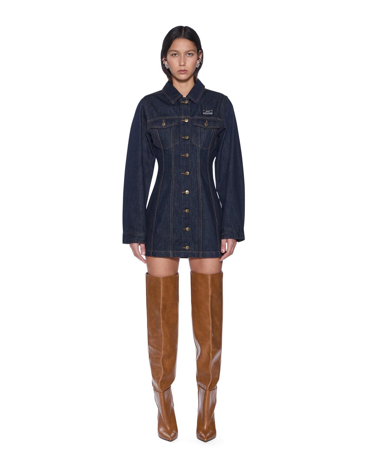 The Contour Dress Original is a fashion-forward mini dress with curved trucker panel lines that create an hourglass silhouette. Crafted from premium rigid raw rinse denim with tobacco topstitching, it features a mini length, dropped shoulders, wide sleeves, a center front shank closure, anti-brass hardware, and a luxe Ksubi metal plate for an elevated finish.