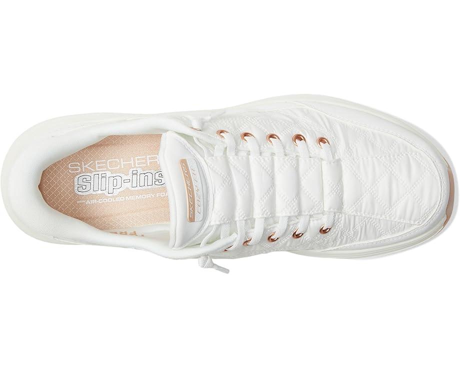 Step into plush luxury and cozy comfort choosing the Skechers® Contour Foam™ - Cozy Fit™ Golden Hour Hands Free Slip-Ins®. Designed with the Exclusive Heel Pillow™ that holds your foot securely in place, this slip-on style features an air-quilted fabric upper and duraleather overlay upper with tied-off stretch laces, Contour Foam™ super lightweight midsole cushioning, and signature cushioned Skechers Air-Cooled Memory Foam® insole.