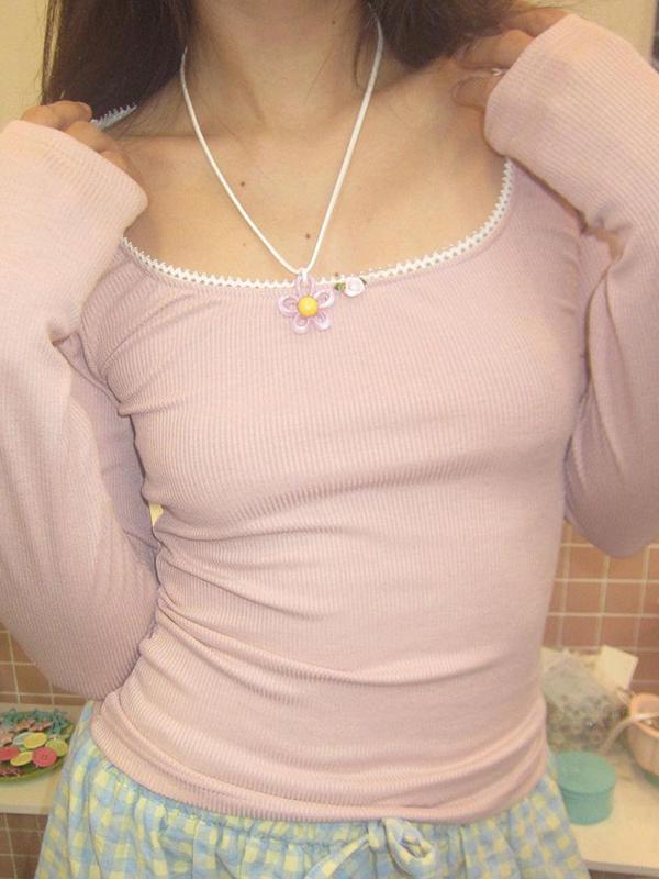 Contrast Color Lace Trim Slim Long Sleeve Knit