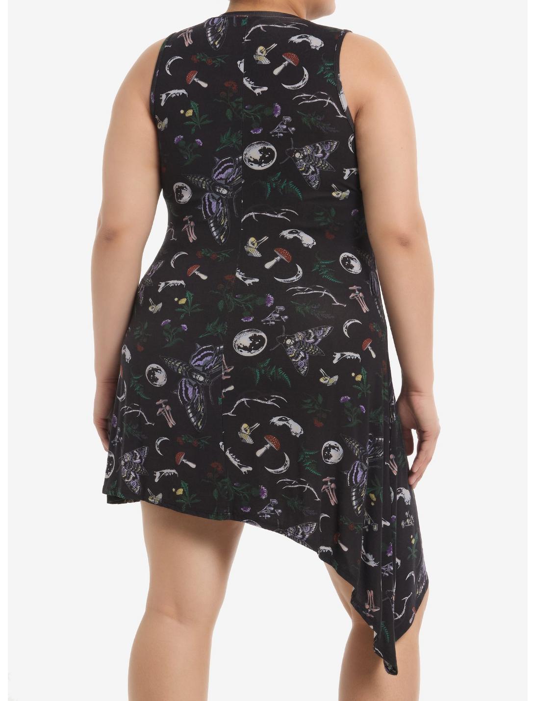 This asymmetrical tank dress has a haunting allover print of moons, mushrooms, animal skulls, death's-head moths and flowers.95% rayon; 5% spandexWash cold; dry lowLength: 35"ImportedModel is 5'10"Model wears size 1