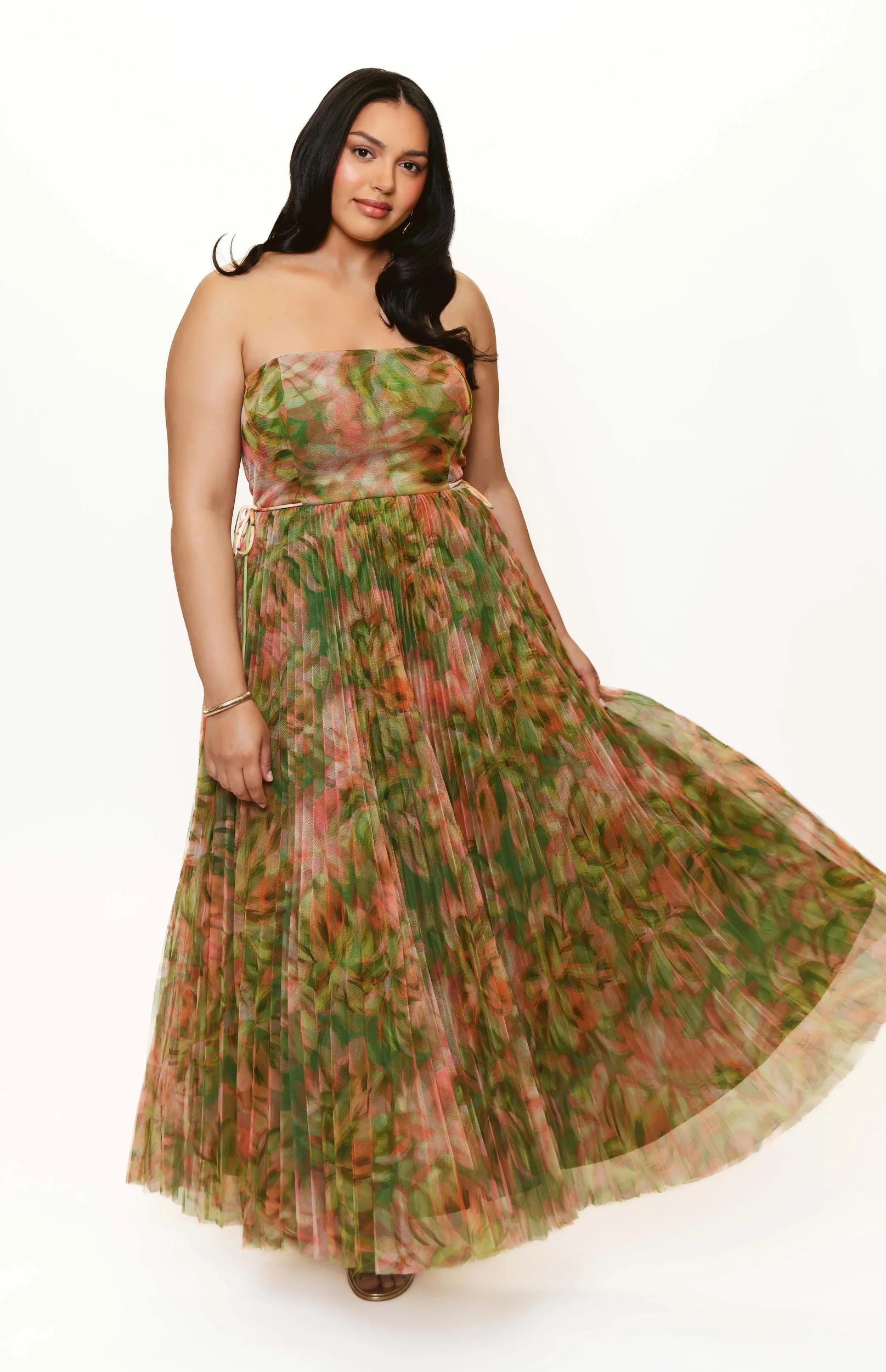 Unleash your inner beauty with this stunning tulle gown featuring side ties and a center back zipper. The tea length adds a touch of elegance while the soft fabric gently hugs your curves. Dry clean only. Fabric measures 55" from HPS - Standard and 56" from HPS - Plus. Lined for the ultimate comfort and style.