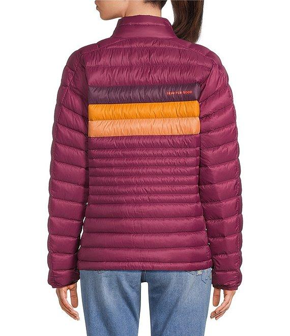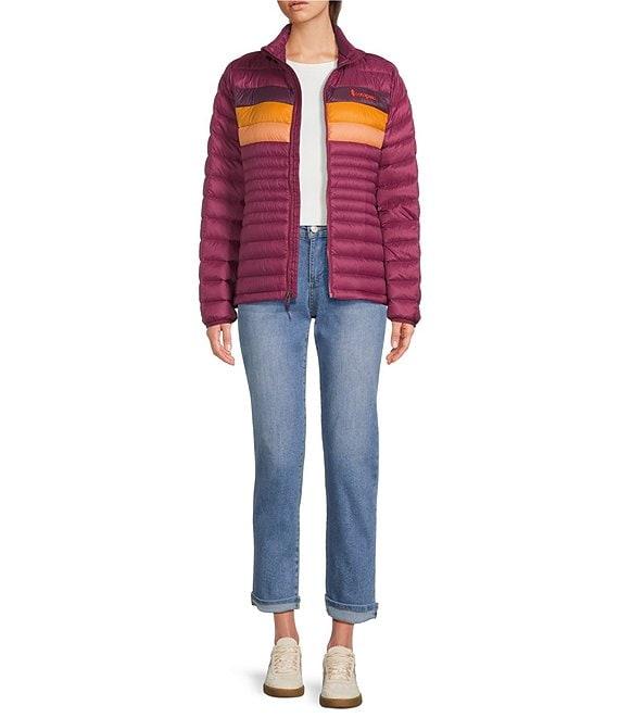From Cotopaxi, this jacket features: Recycled fabrication Stripe print Stand collar neckline Long sleeve Front pockets Lightweight 800-down fill Fitted fit Fully lined Straight hemline Zip front closure Ripstop nylon/CO DWR finish Machine wash Imported.