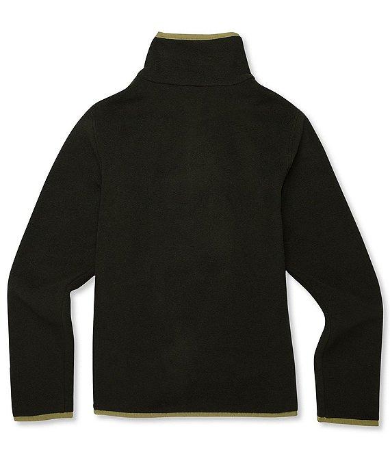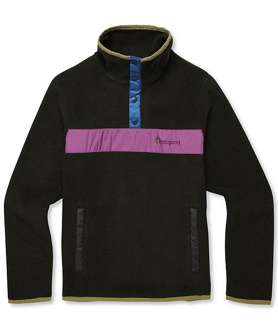 From Cotopaxi, this pullover features: fleece fabrication mock neckline long sleeves kangaroo hand pockets elastic binding at collar, hem, and cuffs DWR finish front center snap closure approx. 25.5" length recycled polyester machine wash Imported.