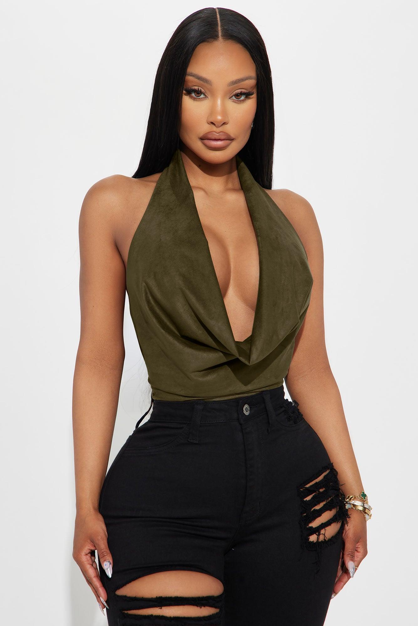 Available In Chocolate And Olive. Halter Bodysuit Cowl Neck Sleeveless Backless Cheeky Bottom Snap Button Closure Suede Stretch Final Sale Shell : 88% Polyester 12% Spandex Imported California Proposition 65WARNING: Cancer and Reproductive Harm - www.P65Warnings.ca.gov.