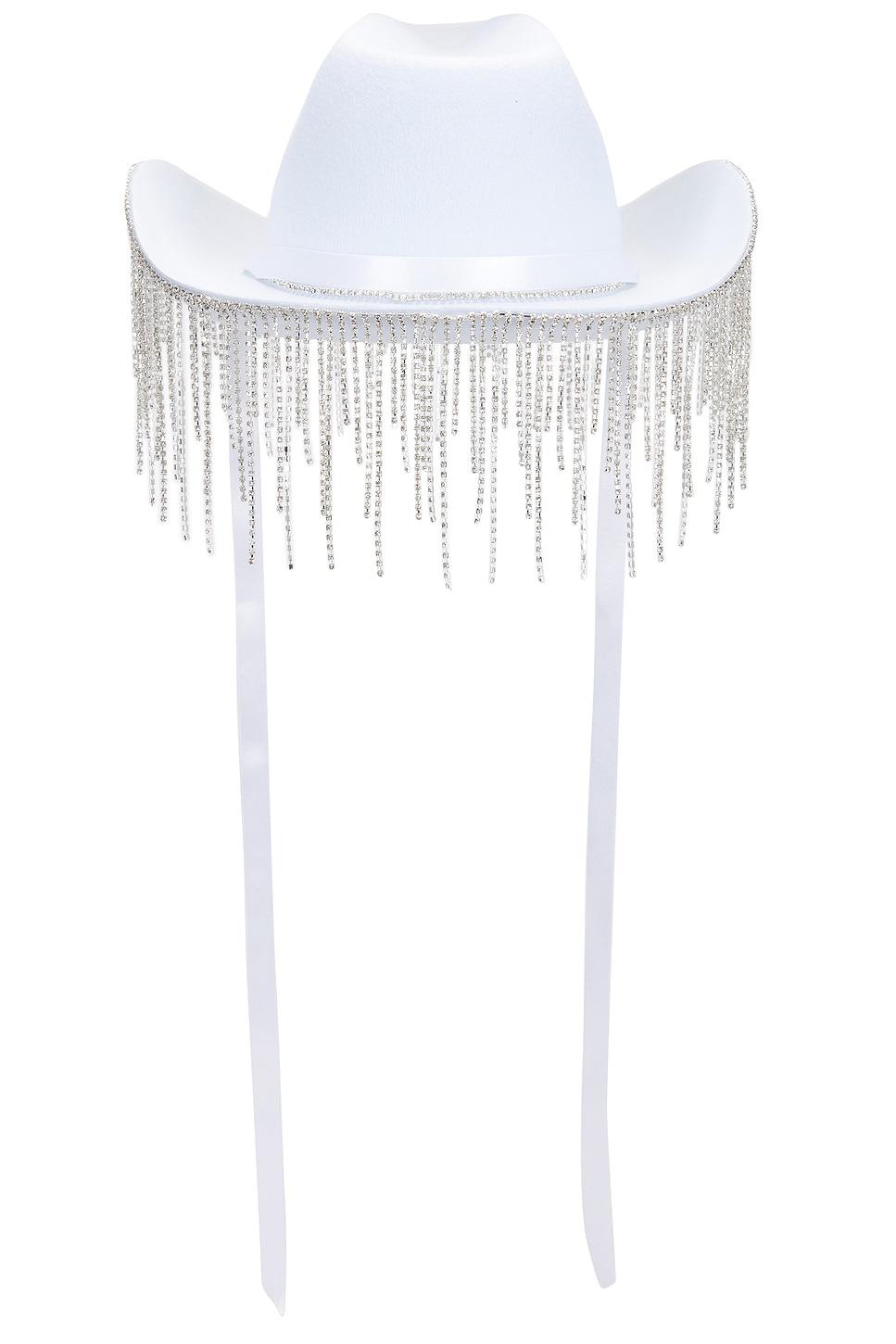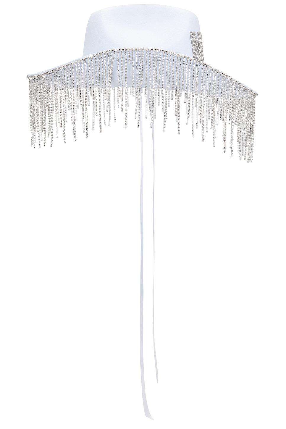 Melton hat with crystal embellished fringe and crystal embellished MRS at front. Pinched crown with satin tie chin strap. Brim measures approx 3.25" in lengthOS measures approx 21.98" in circumference. Made in China. Revolve Style No. GLIR-WA13. Manufacturer Style No. GG_O_1303.