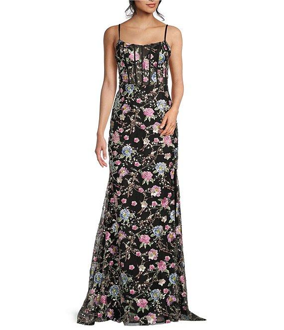 Coya Collection Floral Sequin Embroidered Scoop Neck Spaghetti Strap Sheer Corset Bodice Side Slit Gown