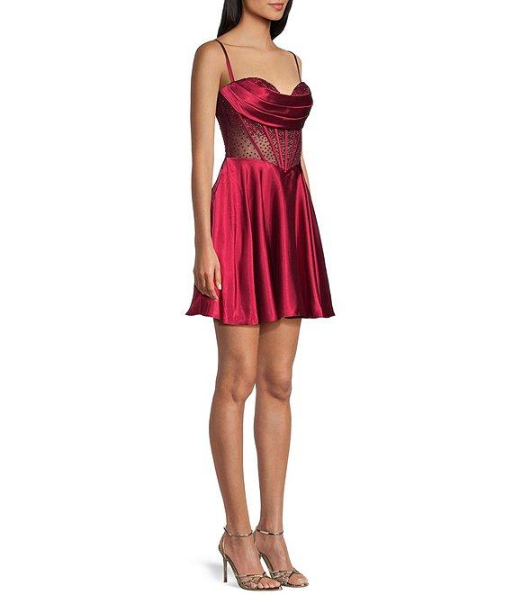 From Coya Collection, this dress features: Satin fabric Sweetheart neckline Sleeveless Adjustable spaghetti straps Corset bodice with beaded illusion detail A-line skirt Lace-up back with zip closure 18" length Polyester; lined Spot clean Imported.