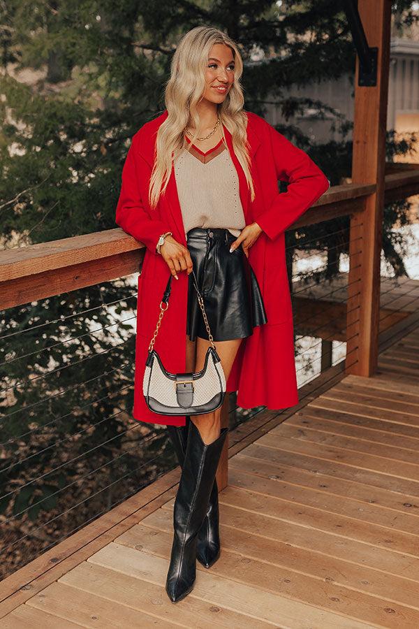 - Elevate your everyday style with this super-cute knit top! Perfect for casual brunch dates and breezy strolls in the park, it's both stylish and cozy. - Unlined knit material with a brown and cream colored color block design and red hued accent trim - A v-cut neckline - Short sleeves - A relaxed silhouette that ends in a straight hemline with accent side slits