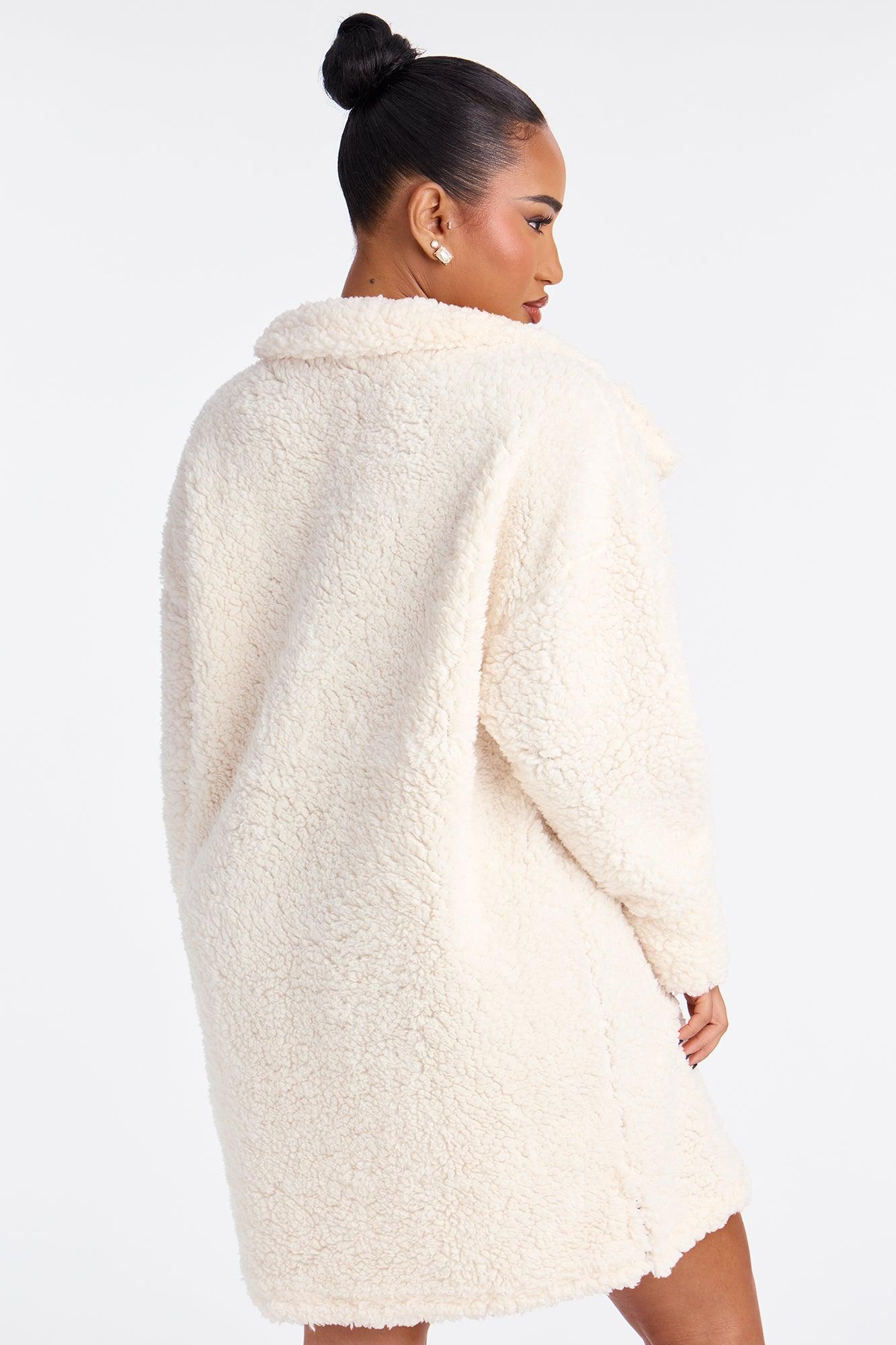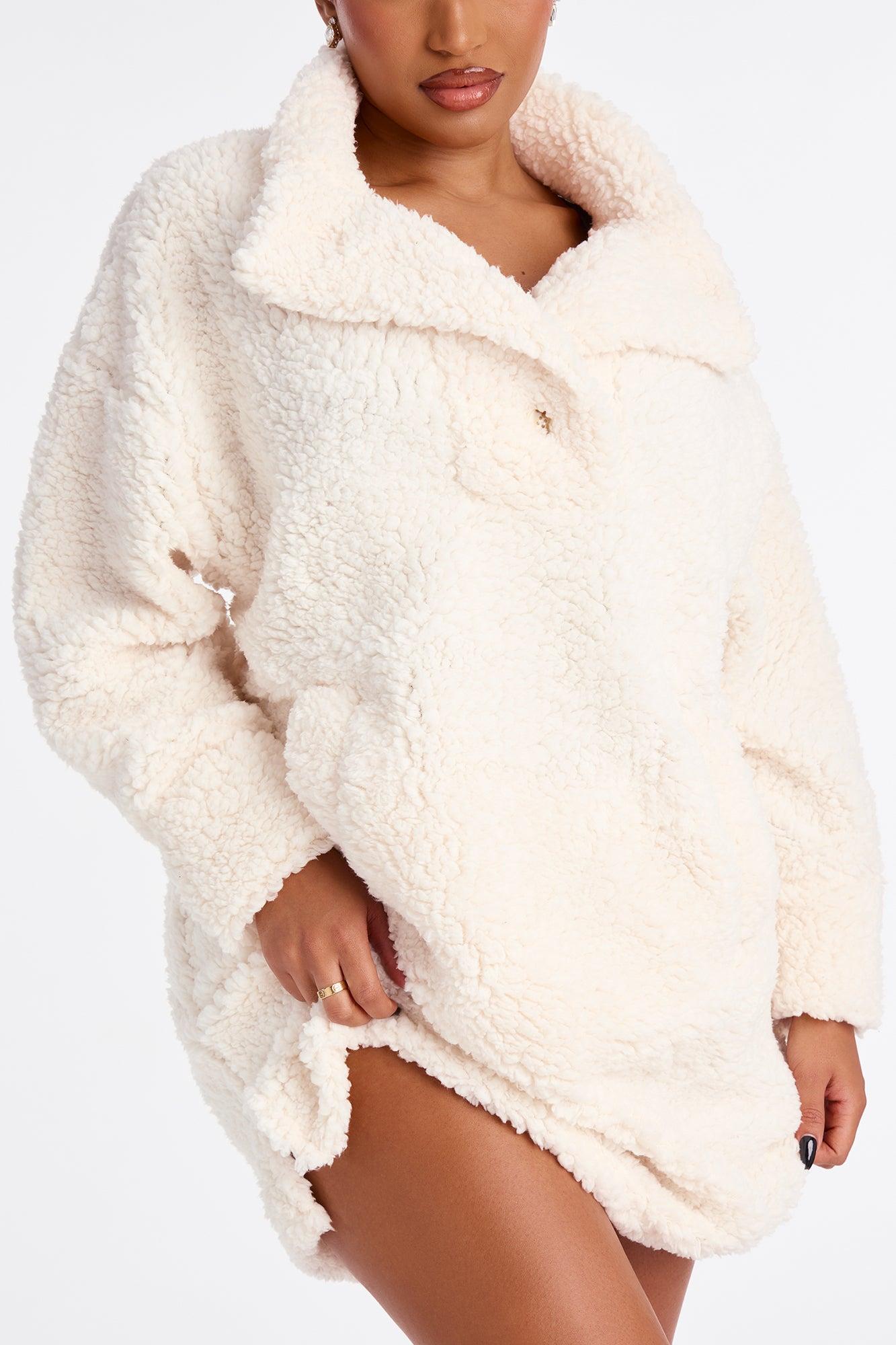 Available In Black And Cream. PJ Robe Sherpa Oversized Pullover Long Sleeves Button Detail Pockets Mini Length Stretch Final Sale 100% Polyester Imported