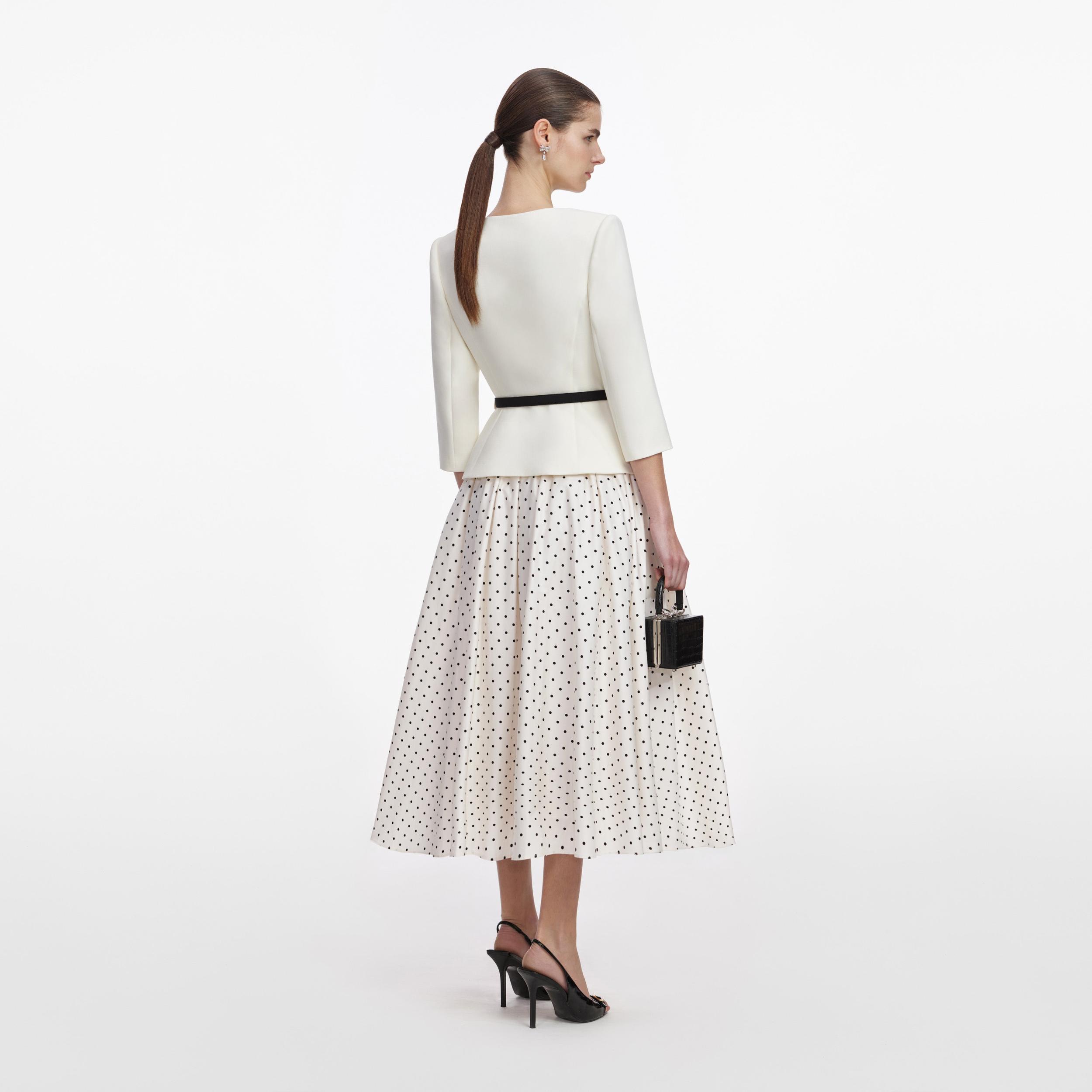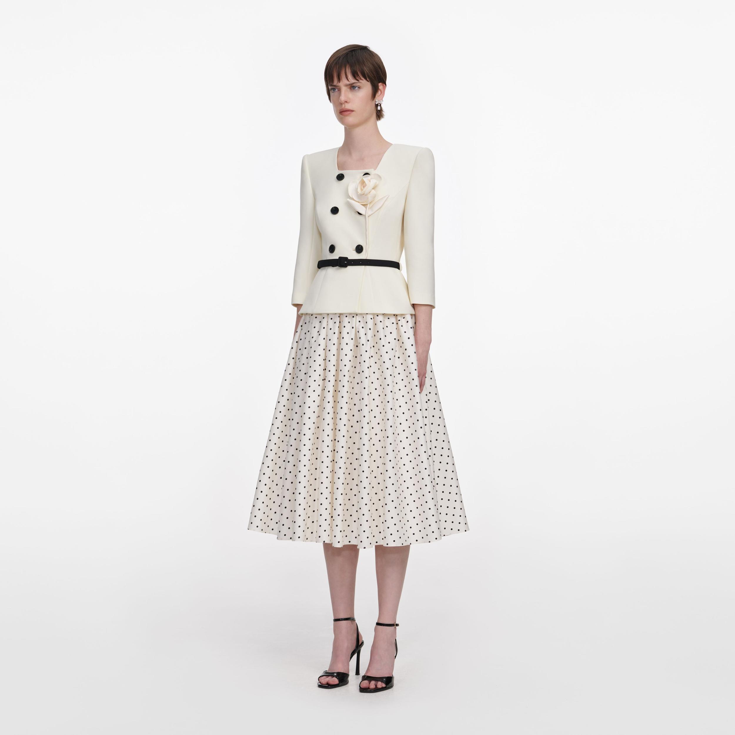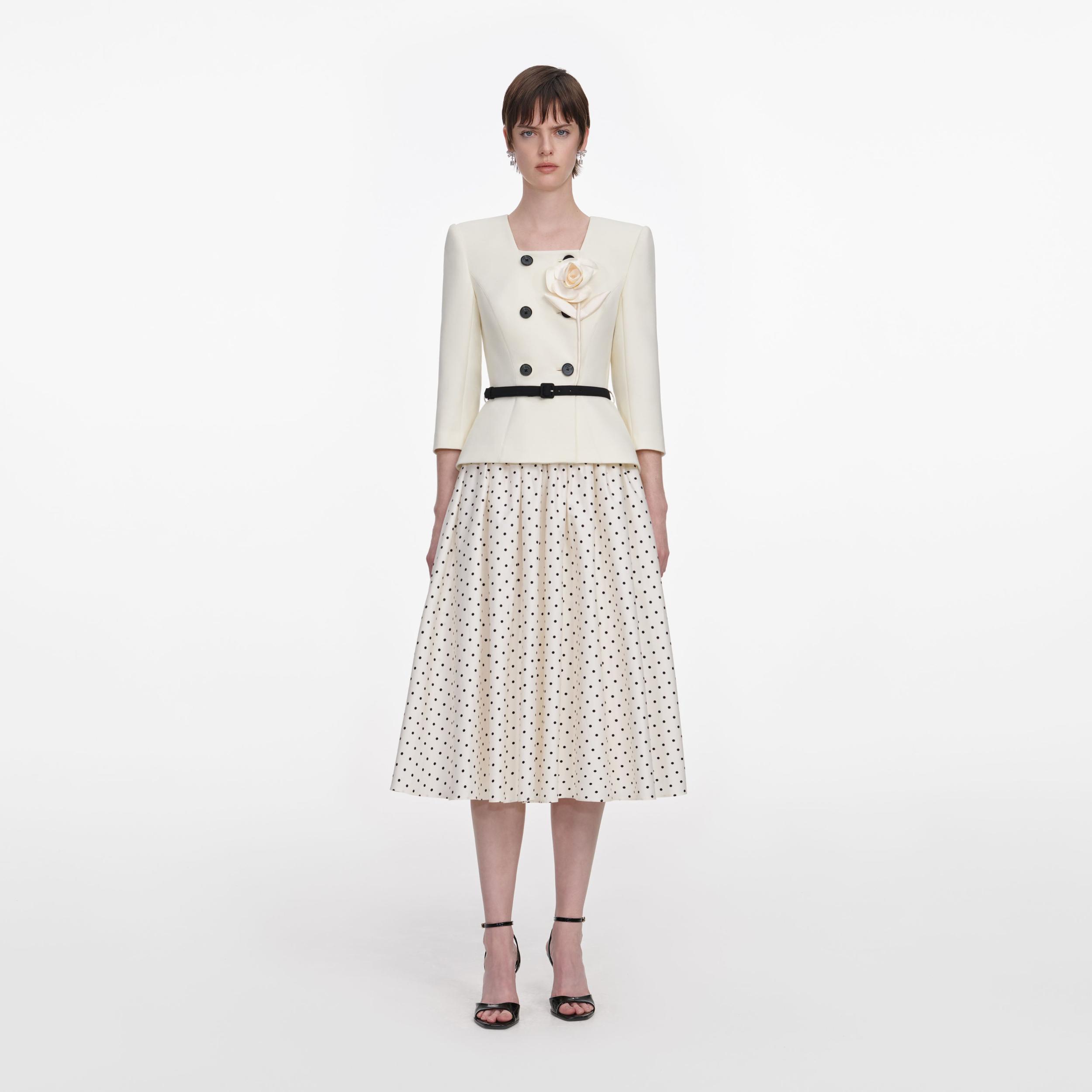 A polka dot print skirt brings light-hearted ease to this tailored midi dress. The cream wool top boasts an elegant flower corsage and suits-all square neckline – add heels for trips to the opera.Fitted styleThis style has minimal stretchButton closure down frontShoulder padsRemovable beltModel is 5ft10/178cm and wears a size UK 6