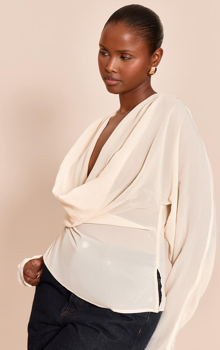 Transform your look in this cream chiffon cowl neck long sleeve blouse. Brought to you in cream chiffon, this blouse has a feminine cowl neckline, long sleeves and split hem detailing. Wear it with relaxed fit jeans and perspex slip on mules for a day-to-night look.Length approx 48.5cm/19inch (Based on sample size US 4)Model wears size UK 8/ EU 36/ AUS 8/ US 4Model Height - 5ft 9inchp]:!mb-4inch>Category: TopsProduct type: BlouseColor: CreamMaterial: ChiffonDesign: PlainNeckline: CowlSleeves: LongOccasion: Evening