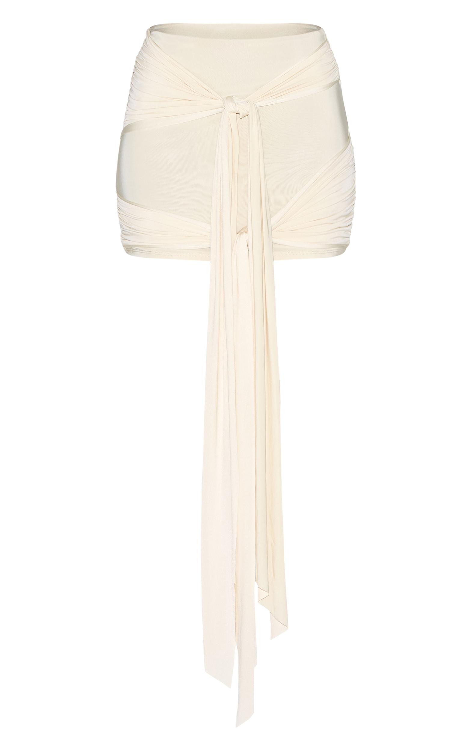 Say hello to your new evening wardrobe staple with this knot detail mini skirt. Made from cream double layer slinky material, this skirt features intricate knot details and an elegant mini length fit. To take your look to the next level, pair this skirt with a cream top, strappy slip on mules and statement gold earrings.Length approx 33cm/13inch (Based on sample size US 4)Model wears size UK 8/ EU 36/ AUS 8/ US 4Model Height - 5ft 9inchp]:!mb-4inch>Brand: PrettyLittleThingCategory: BottomsProduct type: Mini SkirtColor: CreamMaterial: Slinky JerseyOccasion: Evening