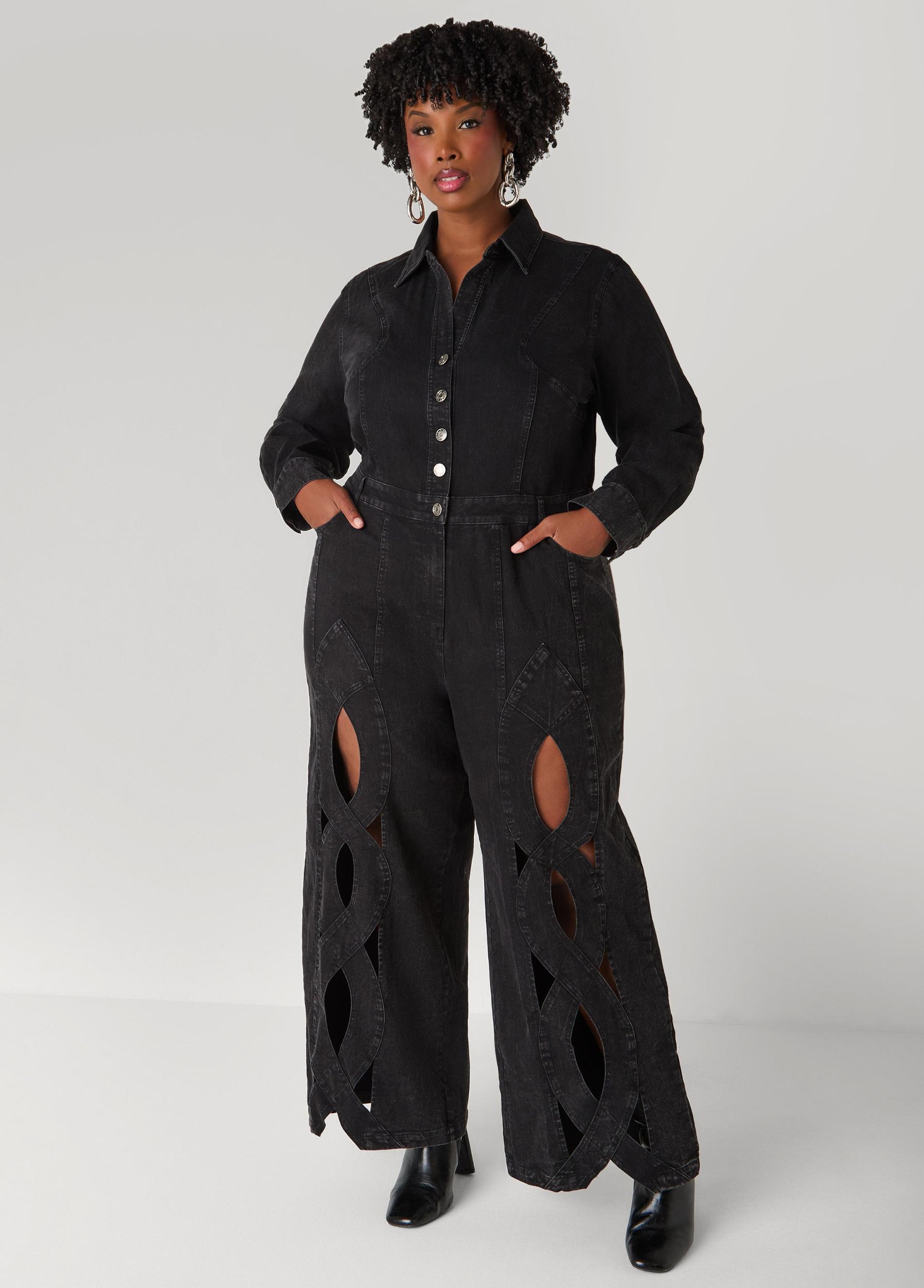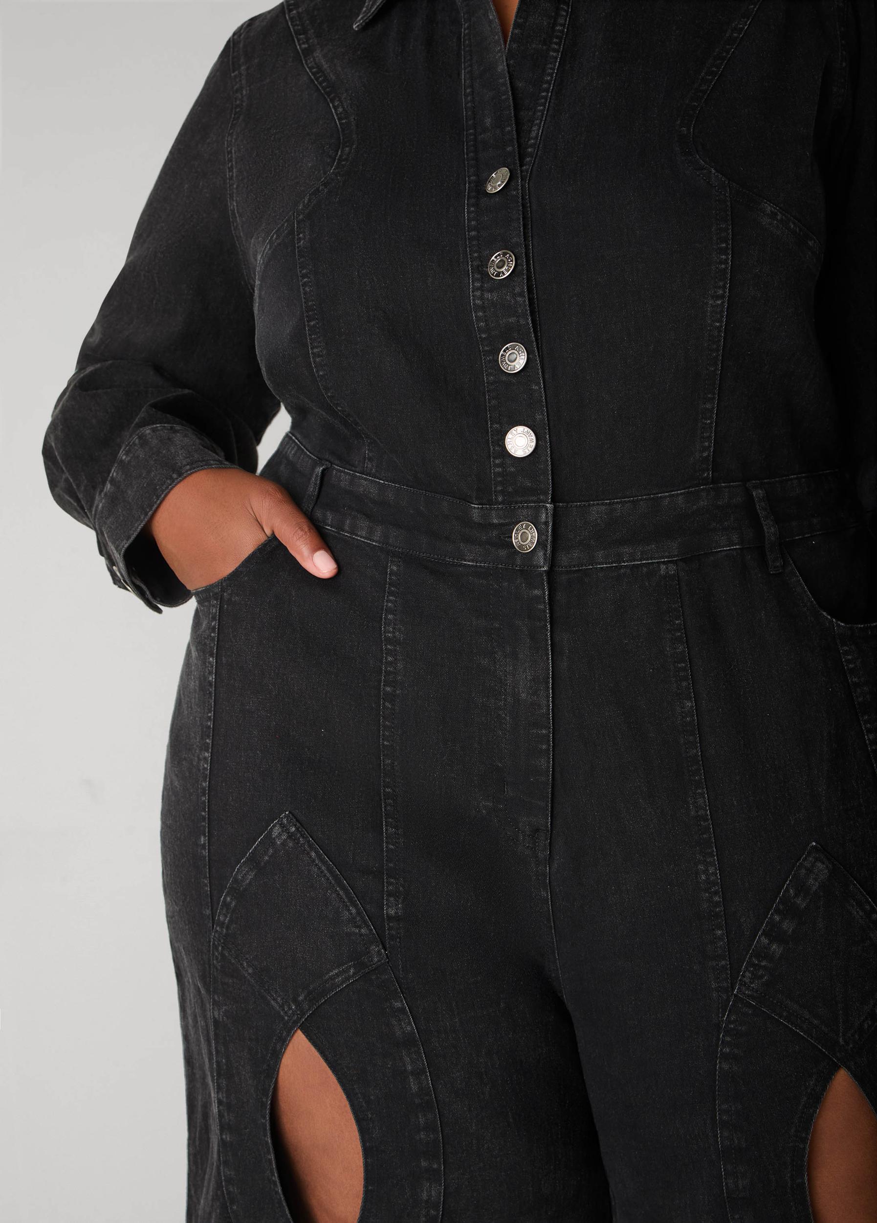This denim wide-leg jumpsuit sizzles with front cutouts and a crisscross detail.
