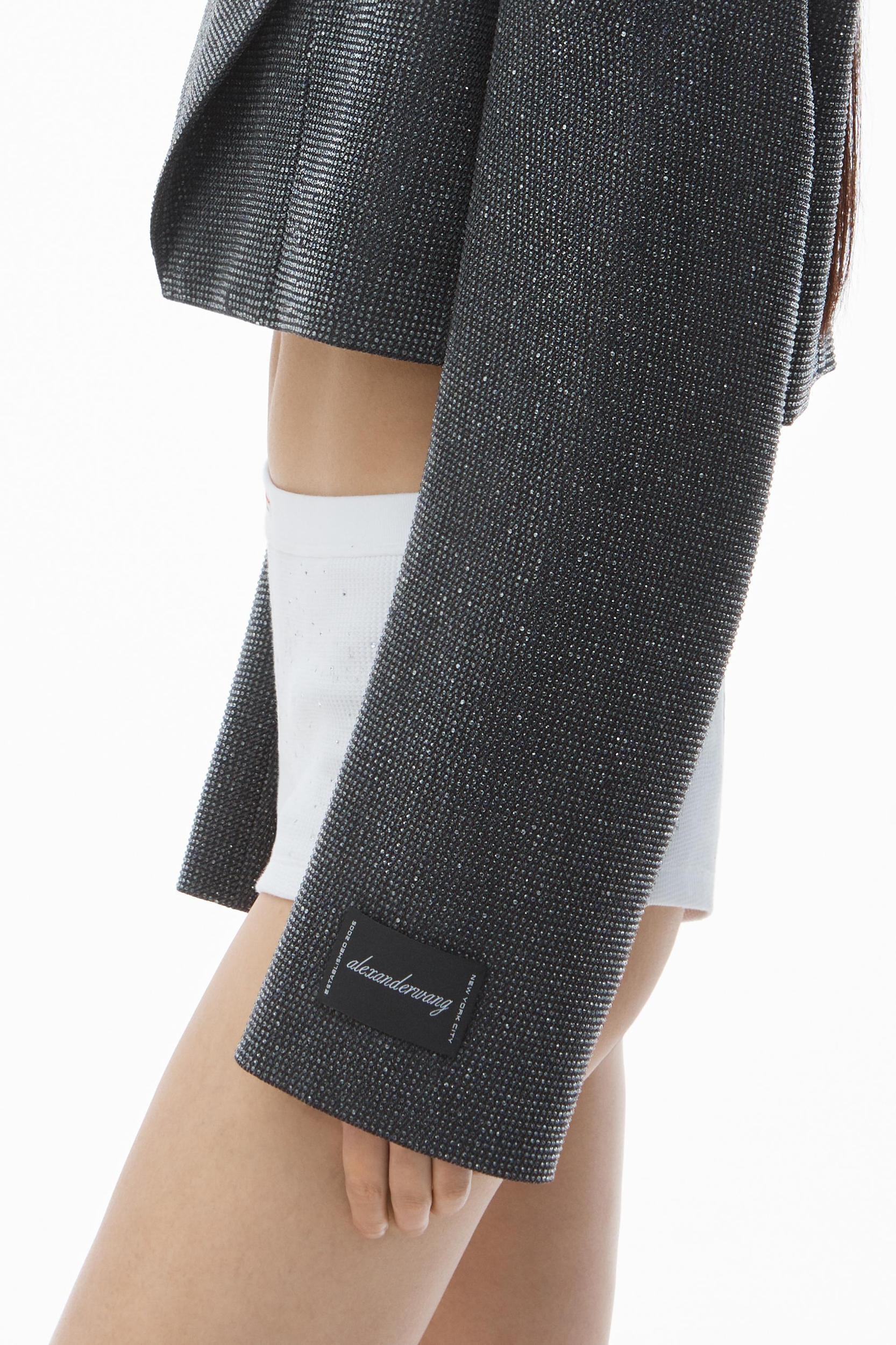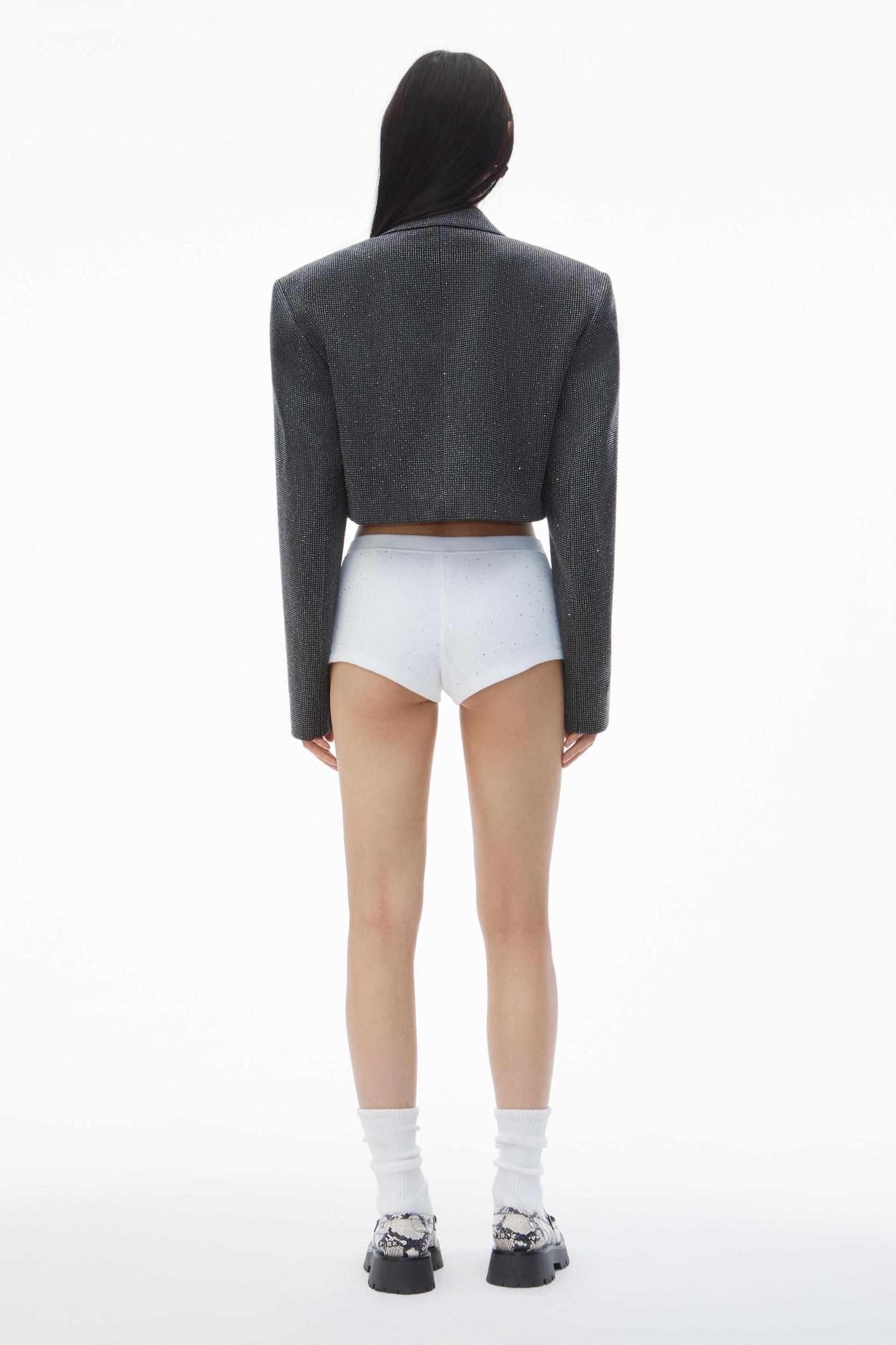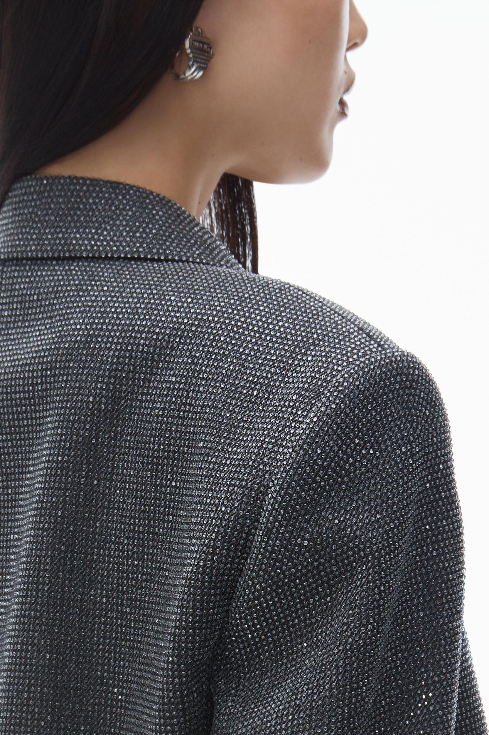 Clear bead crystal hotfix creates a glossy wet look to this cropped charcoal wool blazer. This tailored layering piece hits at the waist and features an open front, chest welt pocket and a logo at the cuff.