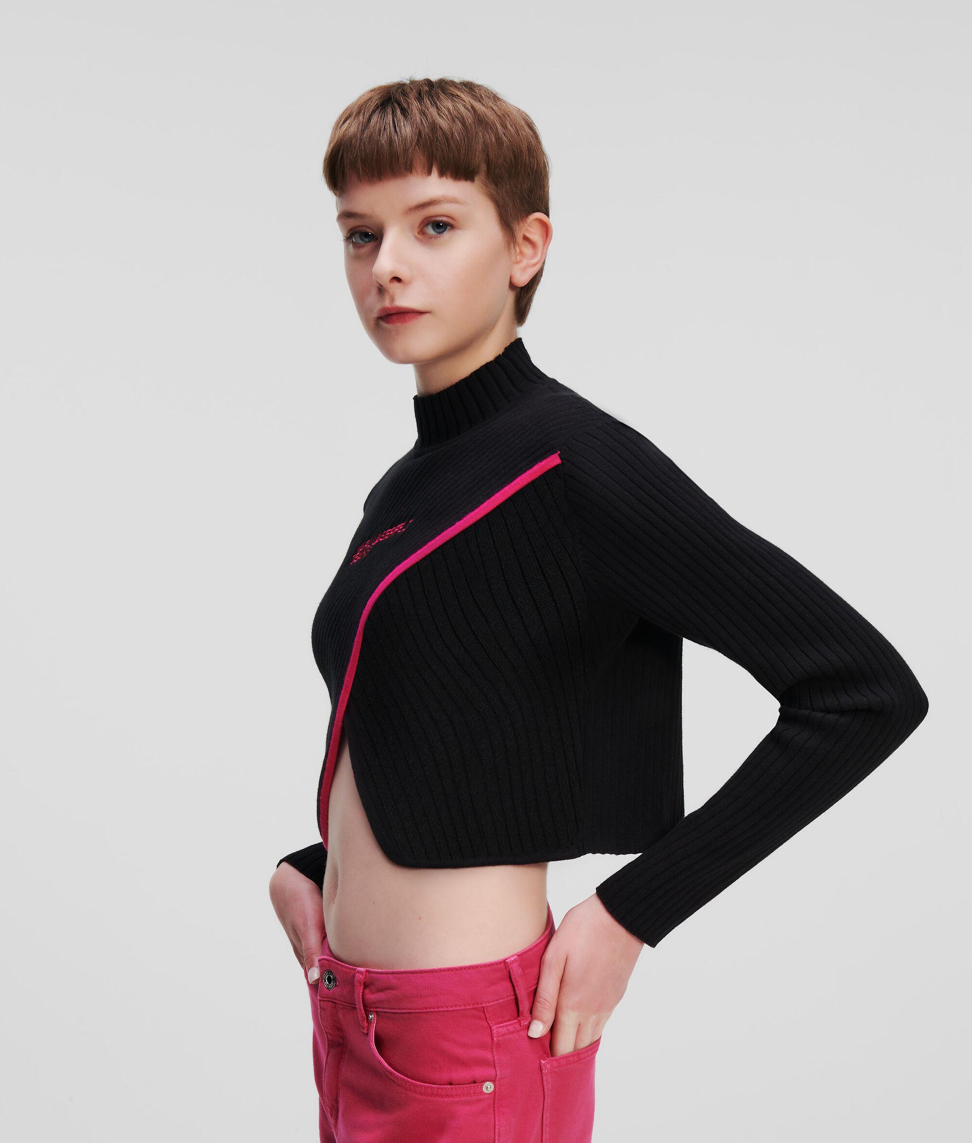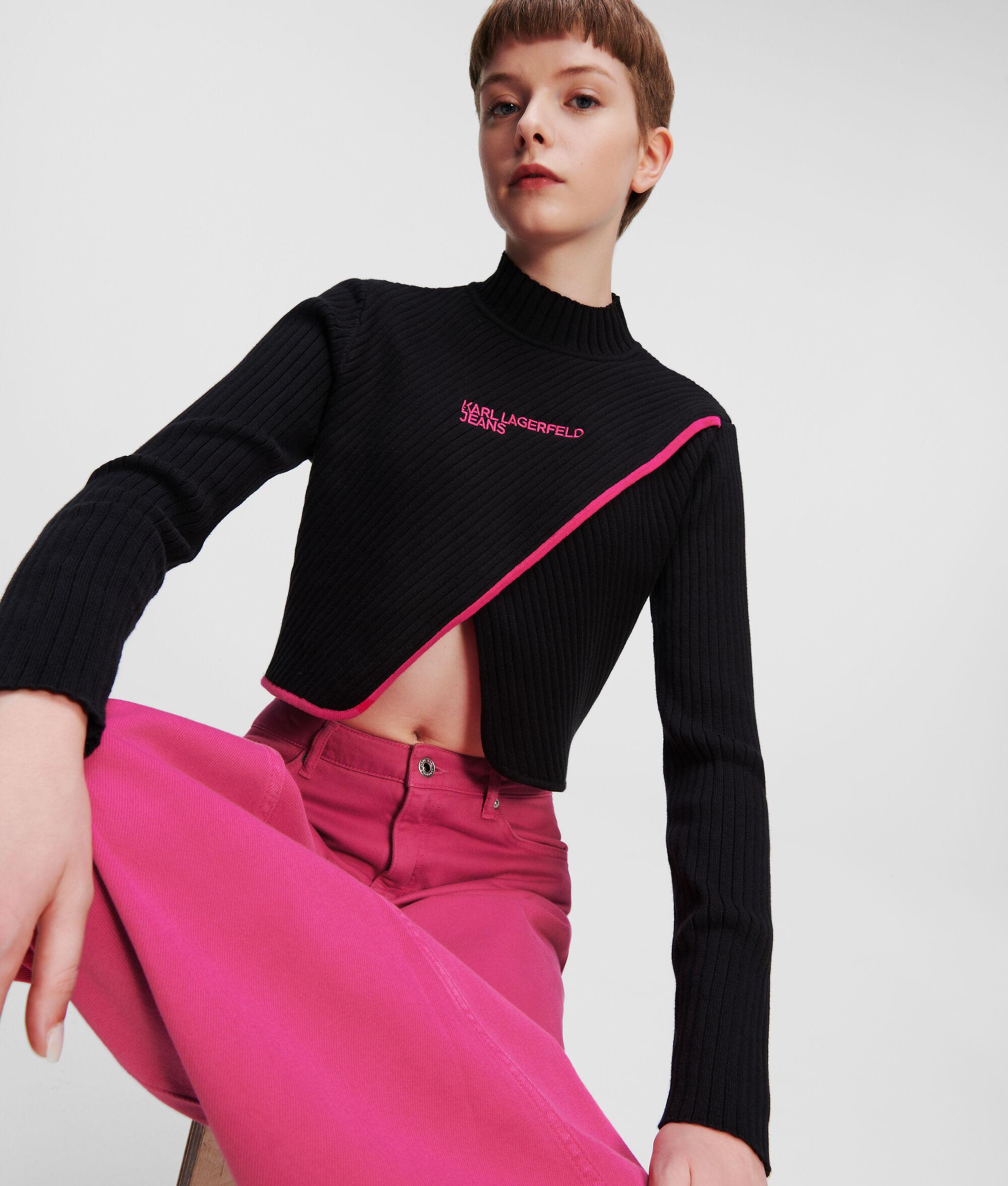A fashion fundamental reinvented. This rib-knit sweater features a cropped silhouette with a cut-out hem and crossover detail. Wear yours with high-waisted jeans or layered over dresses.