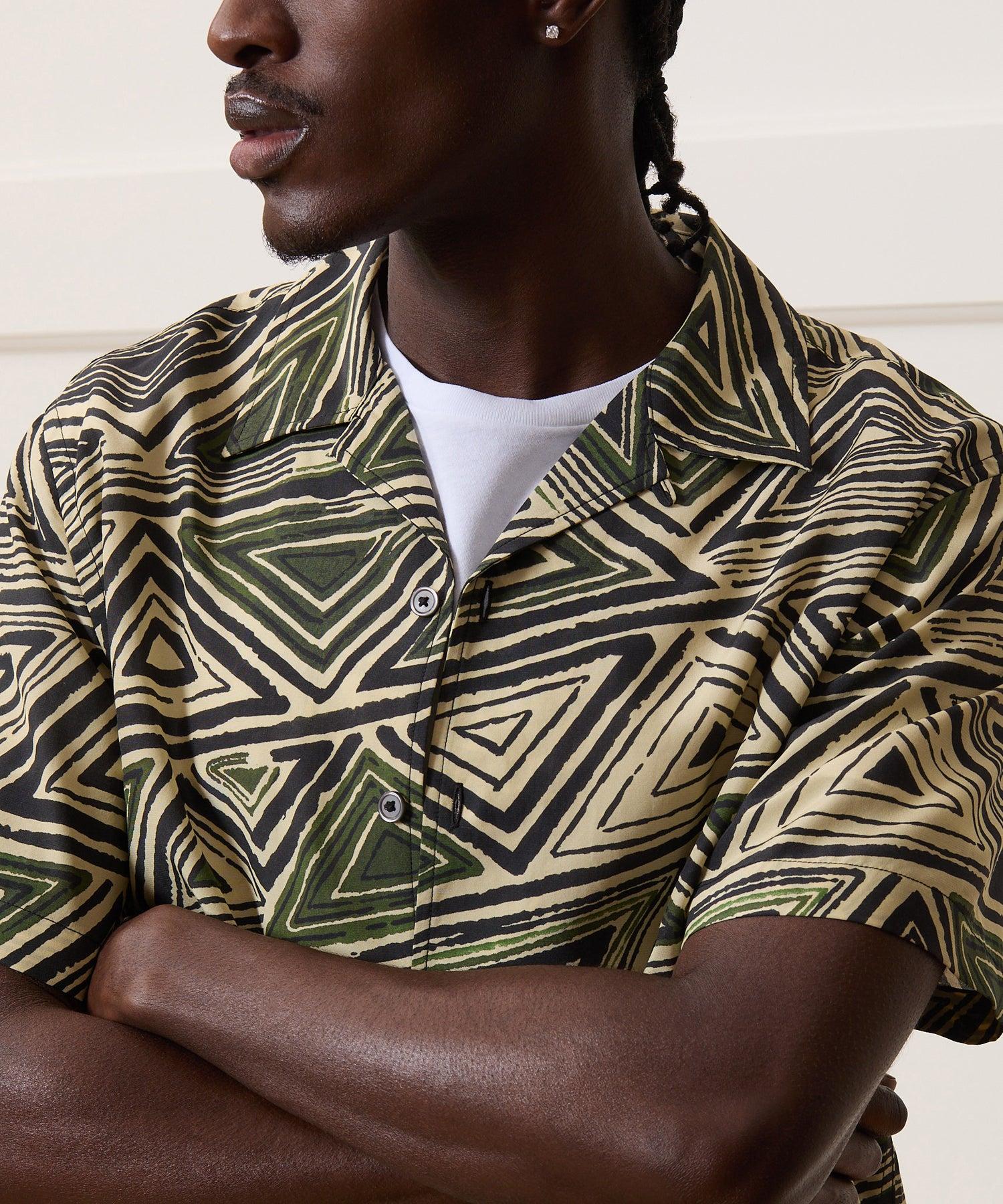 Effortlessly cool. This Camp Collar Shirt is crafted from a refined silk-cotton fabric with a lightweight, airy feel. It’s printed in shades of black, green and tan, in a bold, abstract triangle pattern based on hand-painted artwork. With a boxy fit, it’s the perfect vacation shirt for days when you want something easy to pop on that still makes an impact — wear it all on its own, or open over a tee or tank. 67% Silk, 33% Cotton Boxy Fit Cropped Model is 6'1" and is wearing a size Medium Camp Collar Split Side Seams Fabric From China Garment Made in Vietnam Dry clean or hand wash cold, separately. Do not machine wash (even if your machine has a "Hand Wash" setting). Non-chlorine bleach only, when needed. Lay flat to dry. Cool iron as needed. Style SH8310202