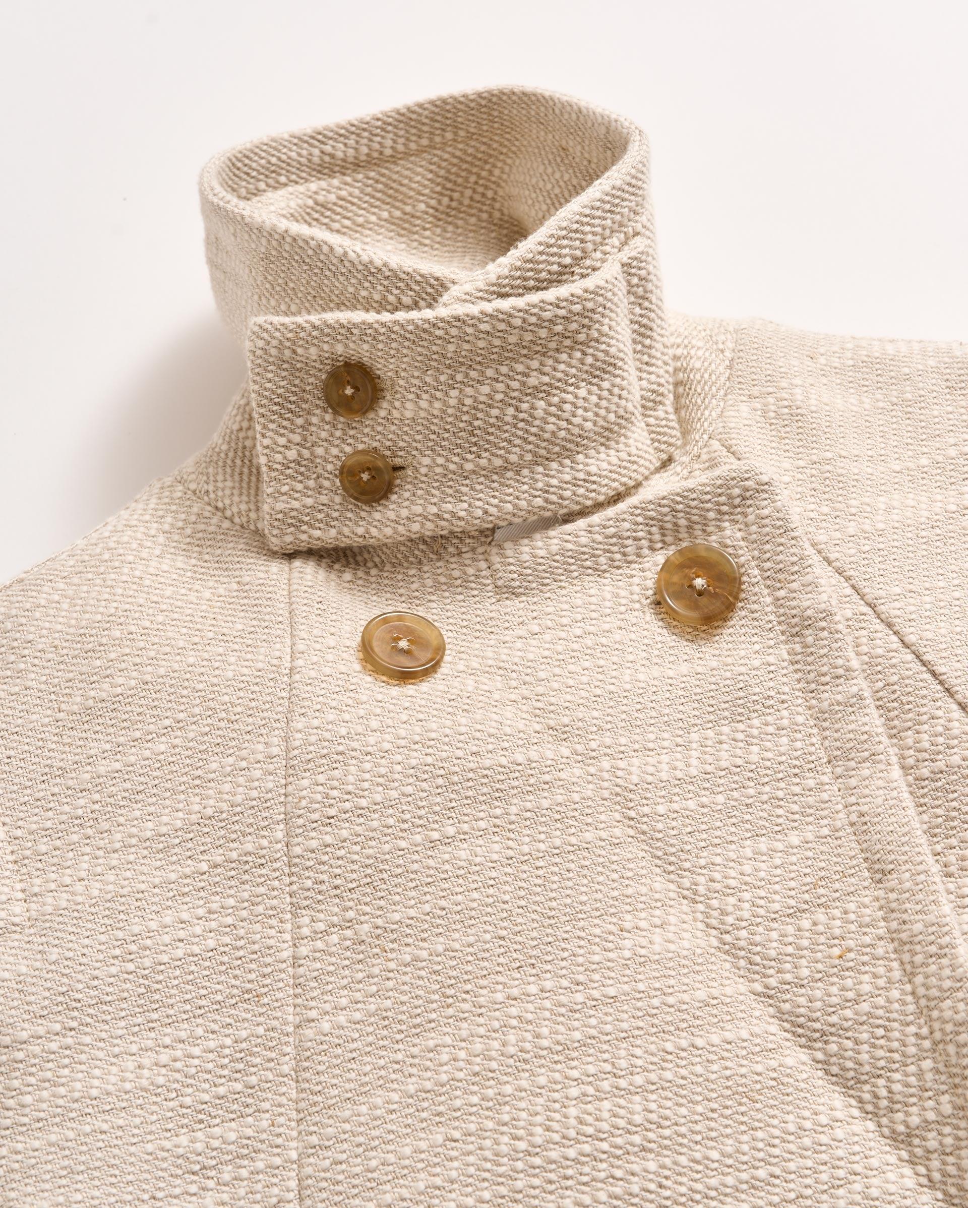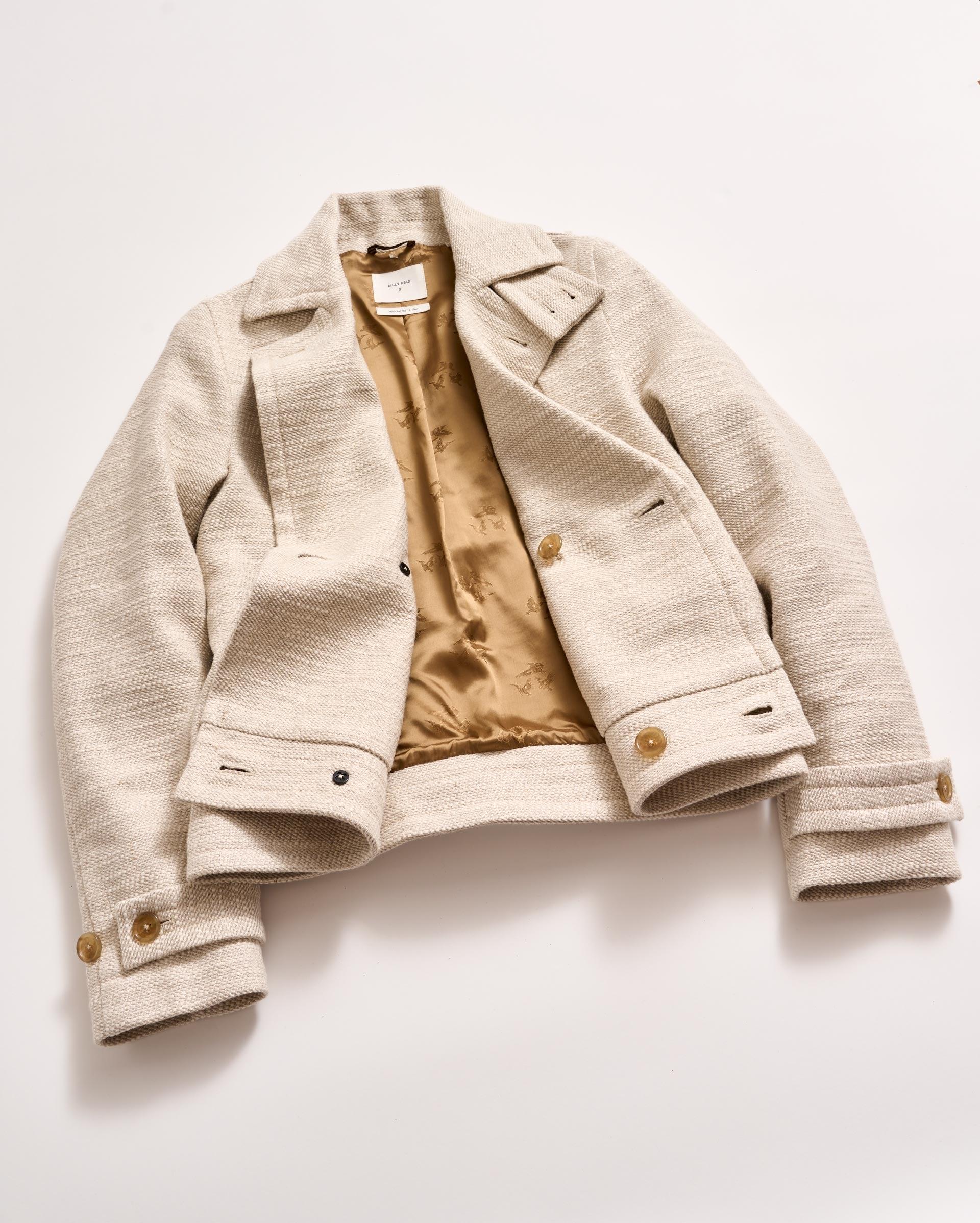 This update on our iconic Bond Peacoat brings all the details of the original with a newly-cropped shape for a more feminine, proportional look. The horizontal slub fabric in cream and white looks great paired with light, airy, spring fashion, without being too heavy for sunny afternoons. The jacket has the classic but