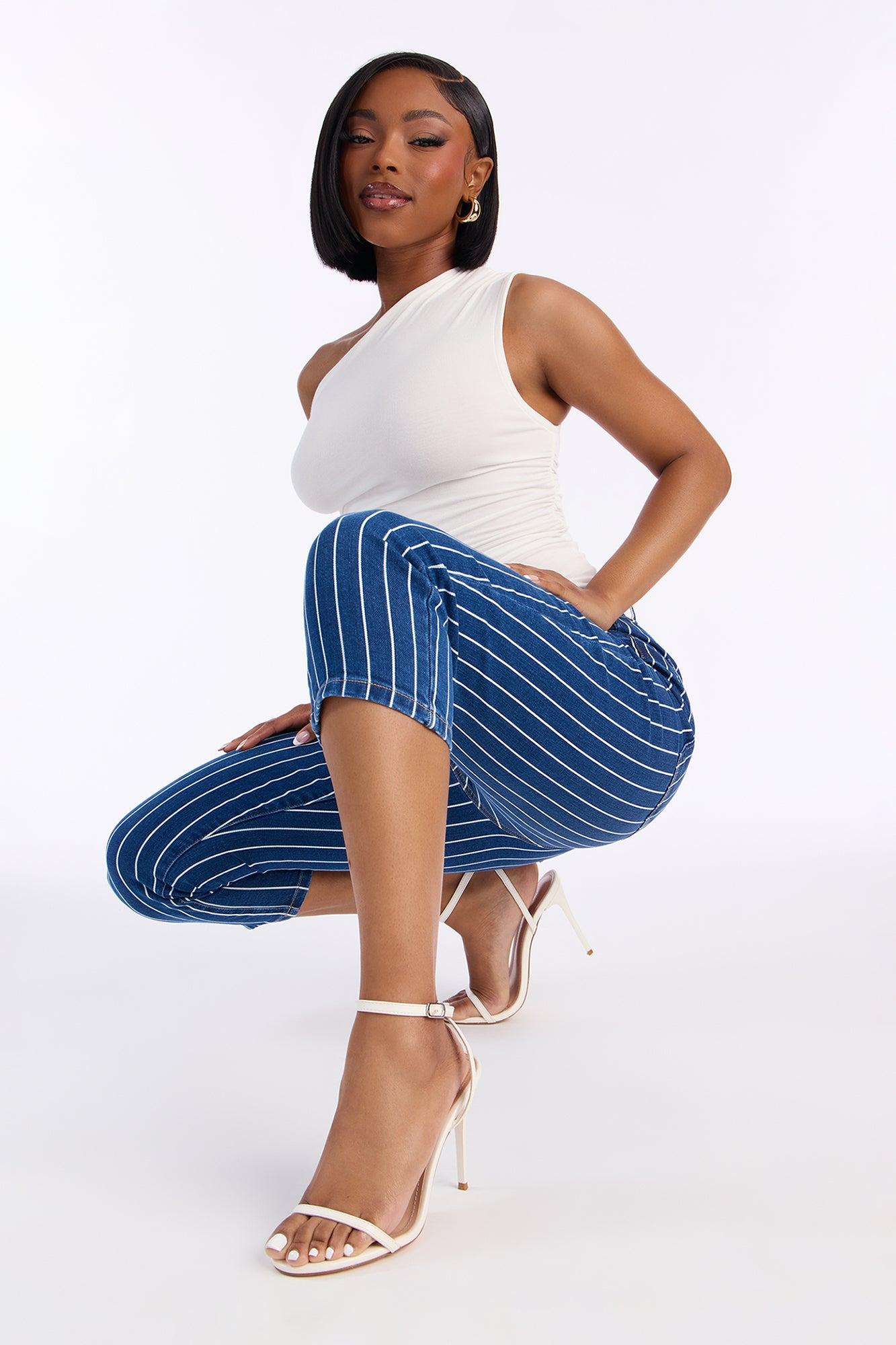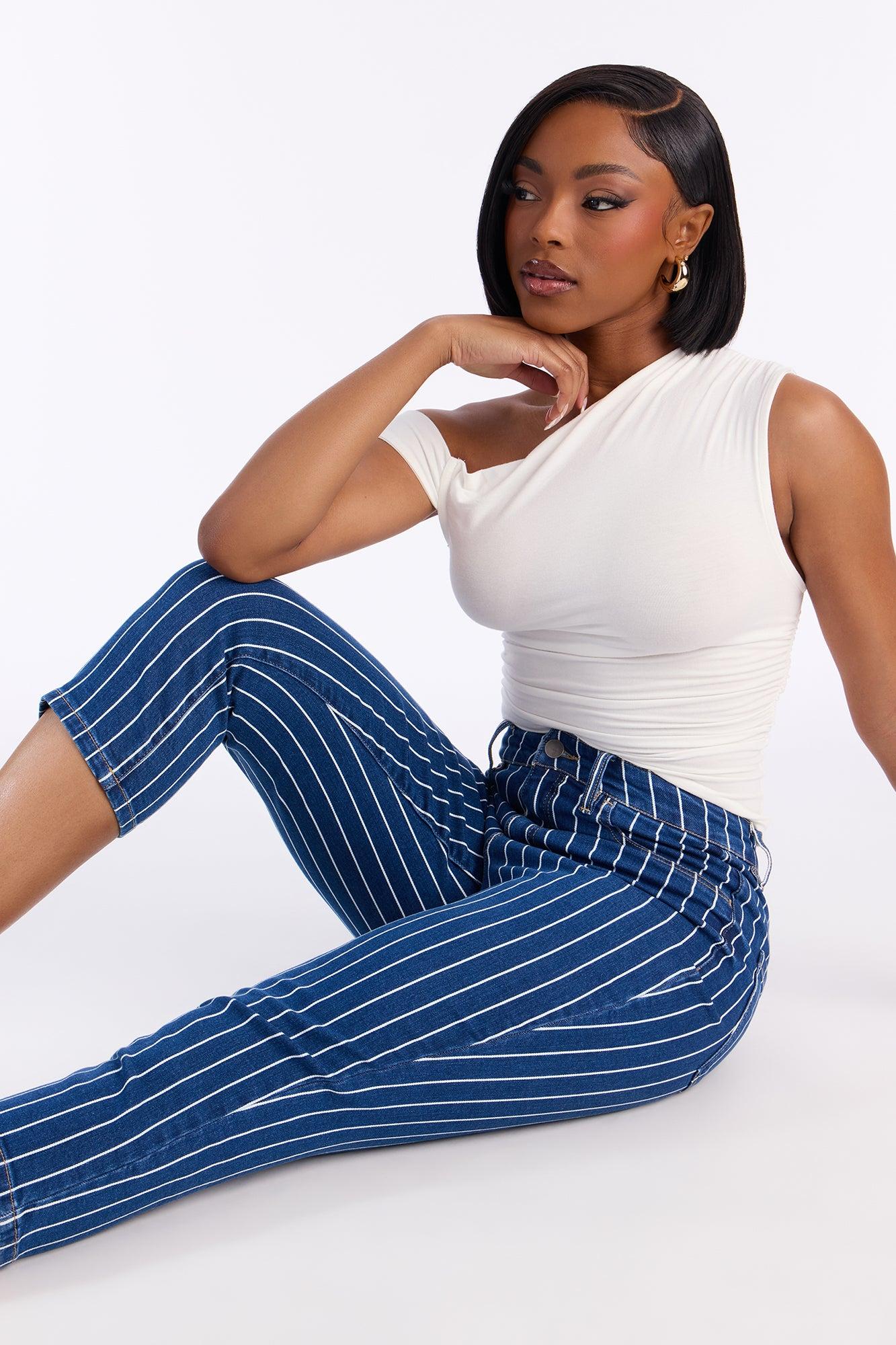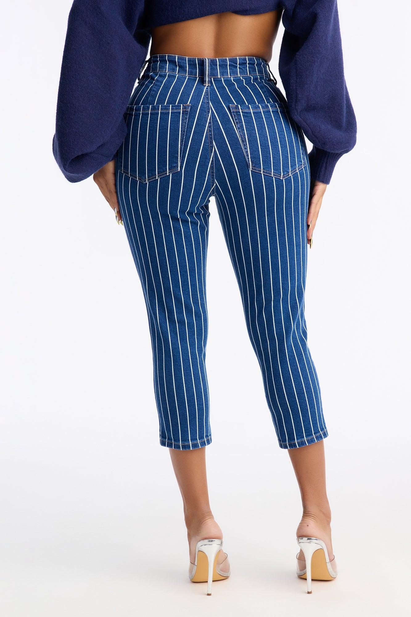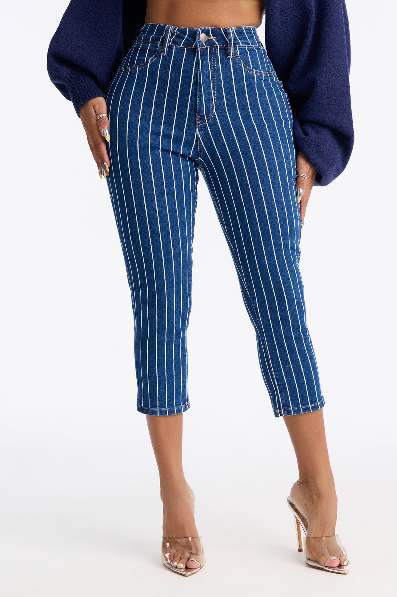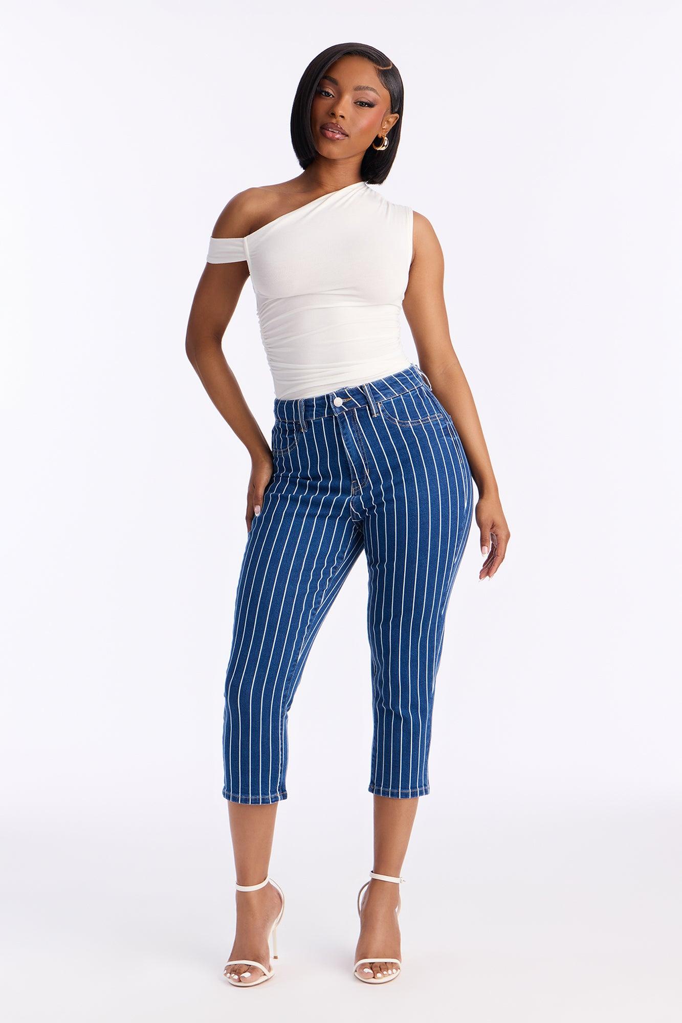 Available In Dark Wash. Skinny Capri Jean Striped Faux Front Pockets Functional Back Pockets 11" High Rise 21" Inseam Medium Stretch Disclaimer: Due To The Specialized Wash, Each Garment Is Unique. 99% Cotton 1% Spandex Imported California Proposition 65WARNING: Cancer and Reproductive Harm - www.P65Warnings.ca.gov.