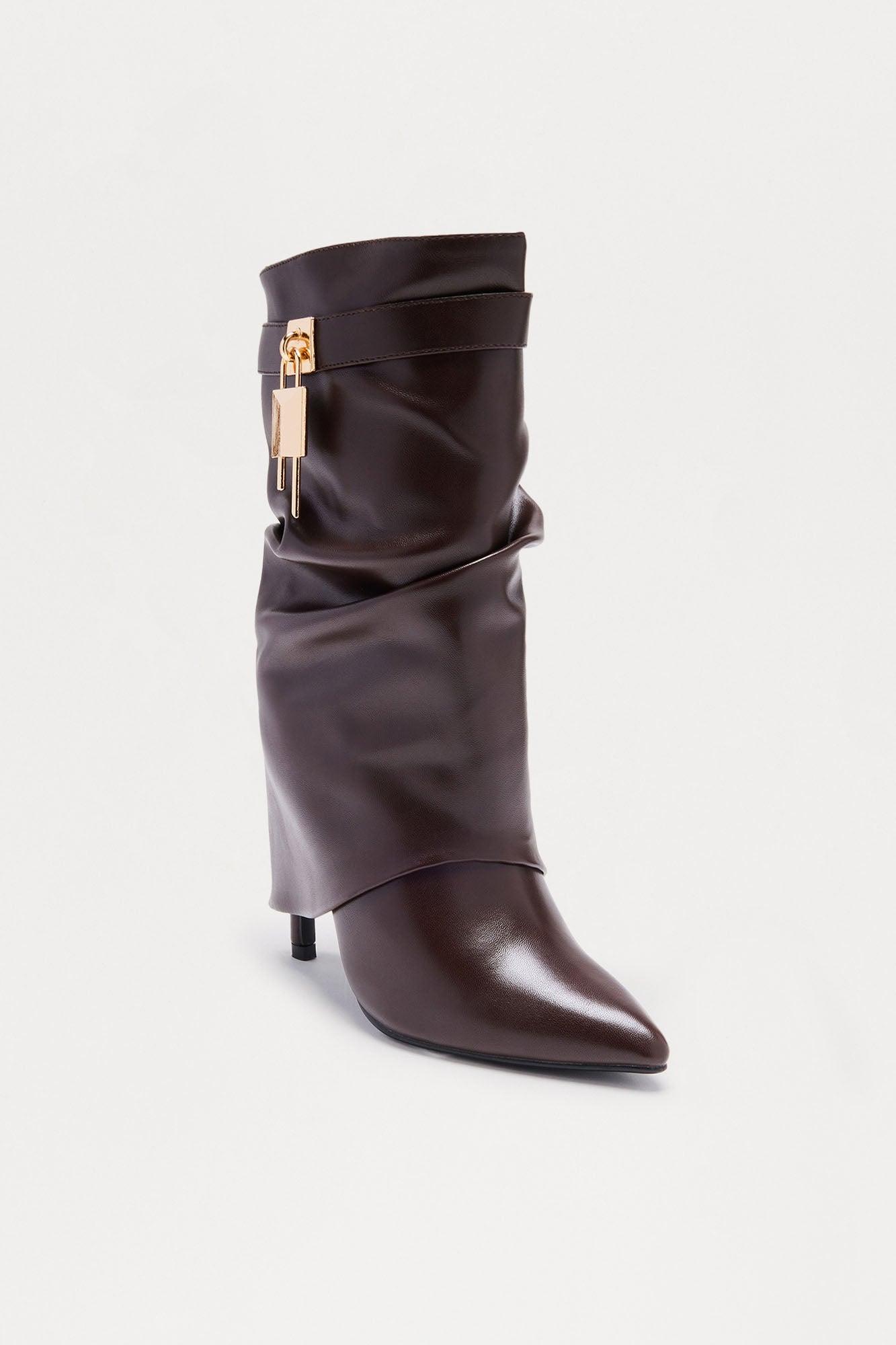 Available In Beige, Black, Brown And Ivory. Heeled Boots Ruched Detail Hardware Detail Overlay Detail Pointed Toe 3.25" High Heel Imported