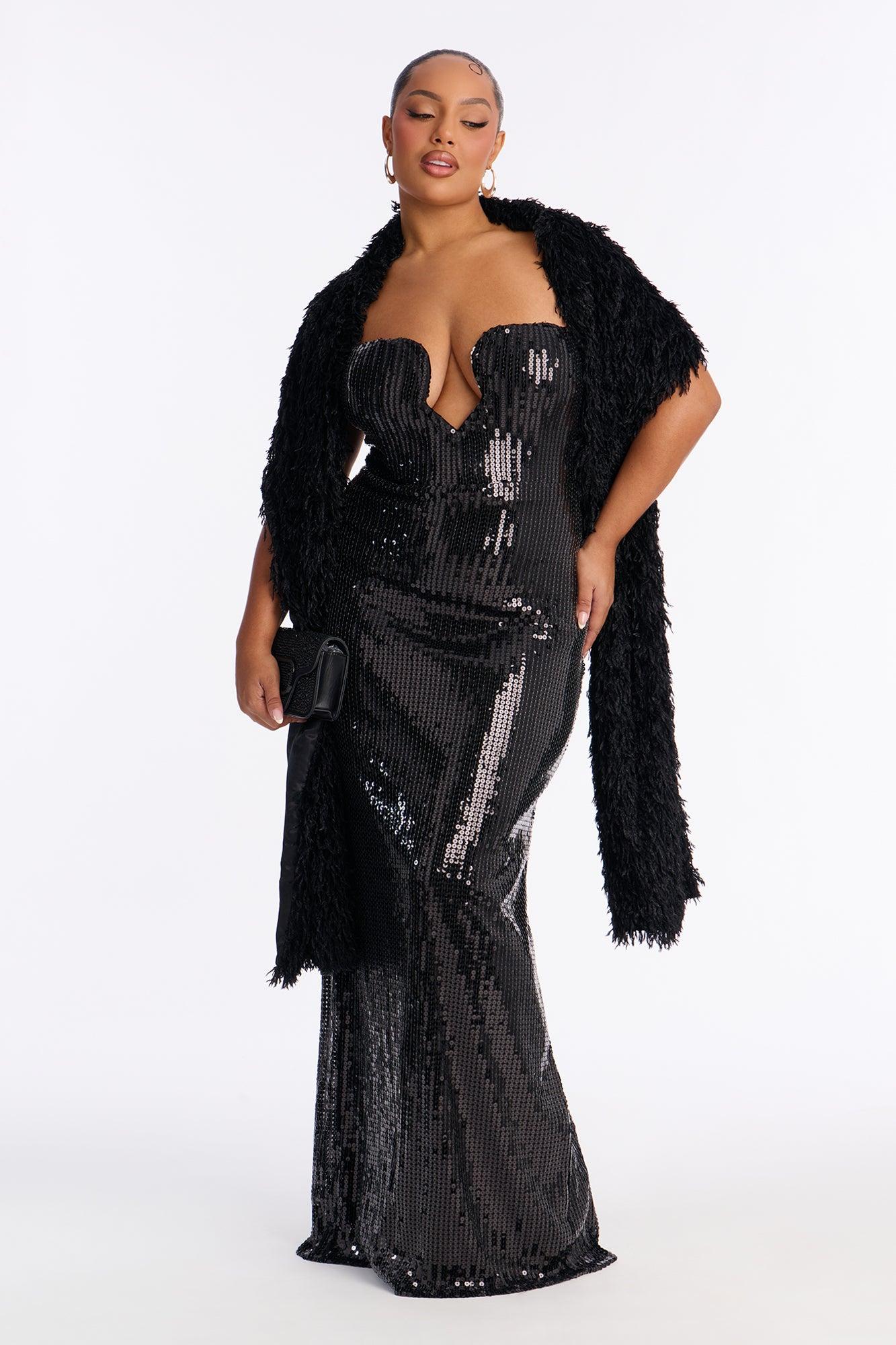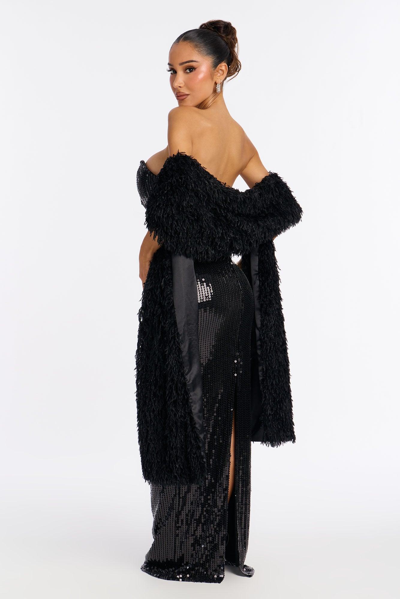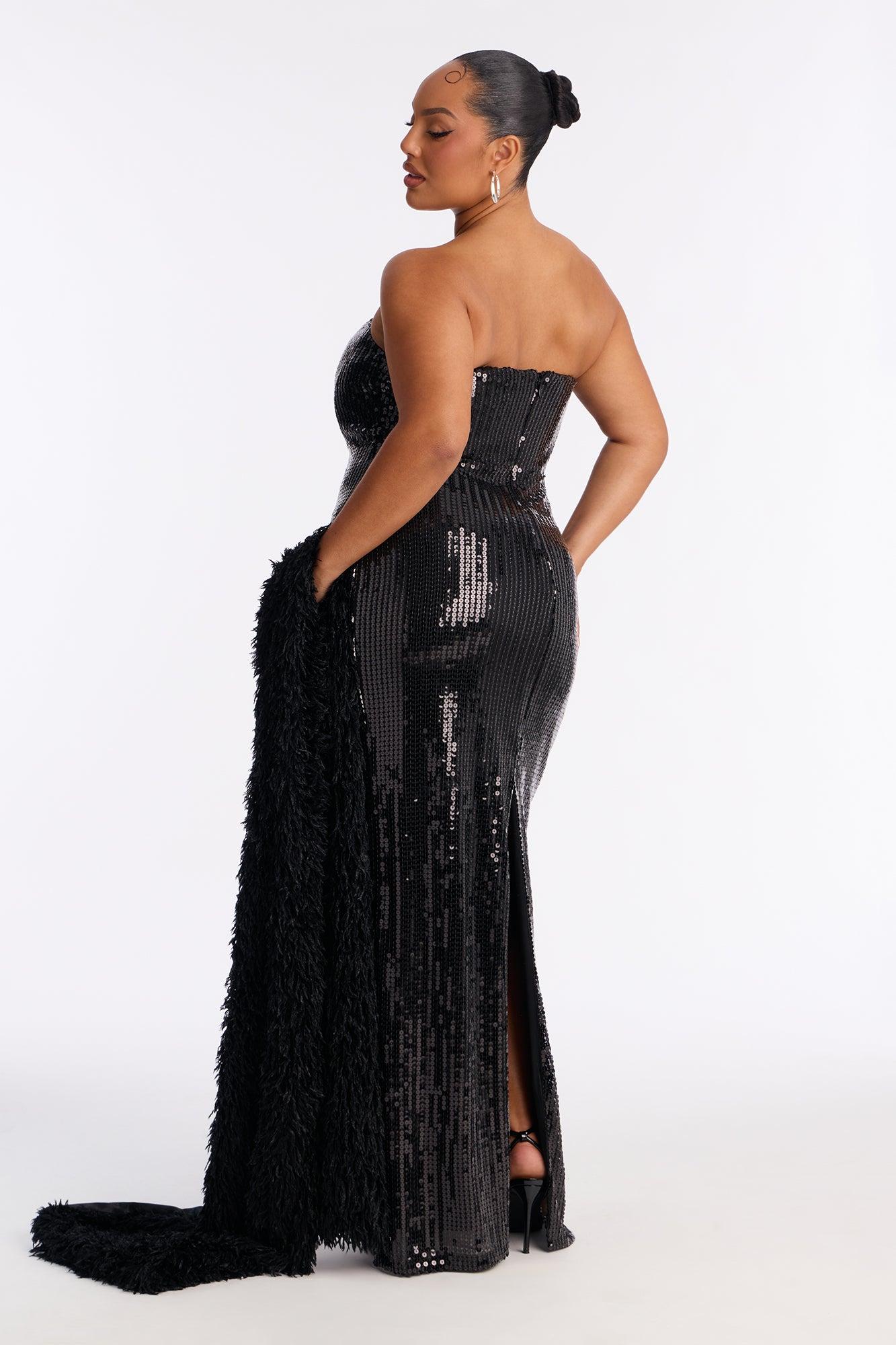 Available In Black And Pink. 2 Piece Shall And Gown Set Feathered Shall Satin Lined Non Stretch Sequin Gown Strapless/Stretch V- Neckline/Wired Padded Bra Cups Back Slit Hidden Back Zipper Closure Dress Self : 95% Polyester 5% Spandex Dress & Shall Lining : 100% Polyester Shall Self : 100% Polyester California Proposition 65WARNING: Cancer and Reproductive Harm - www.P65Warnings.ca.gov.