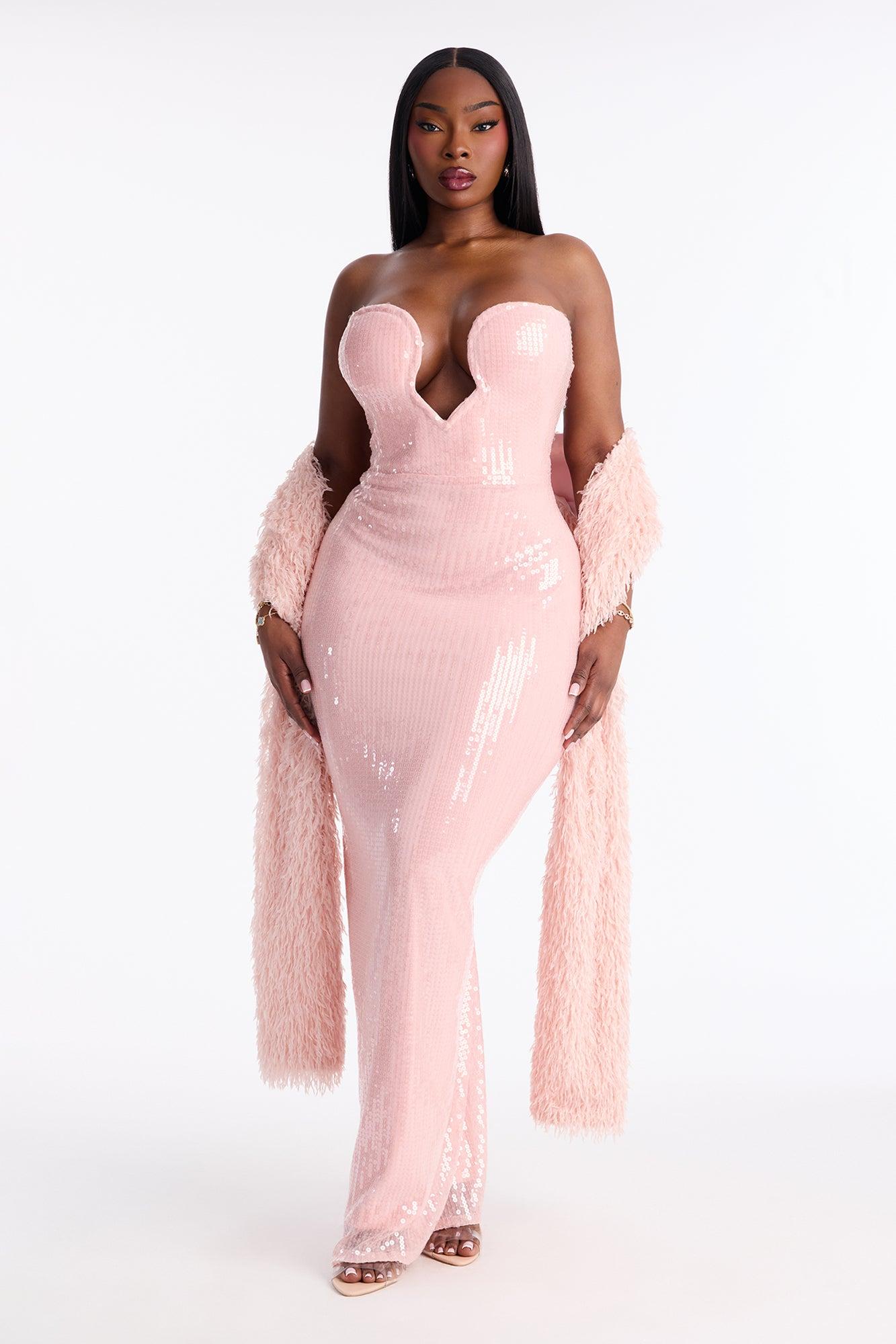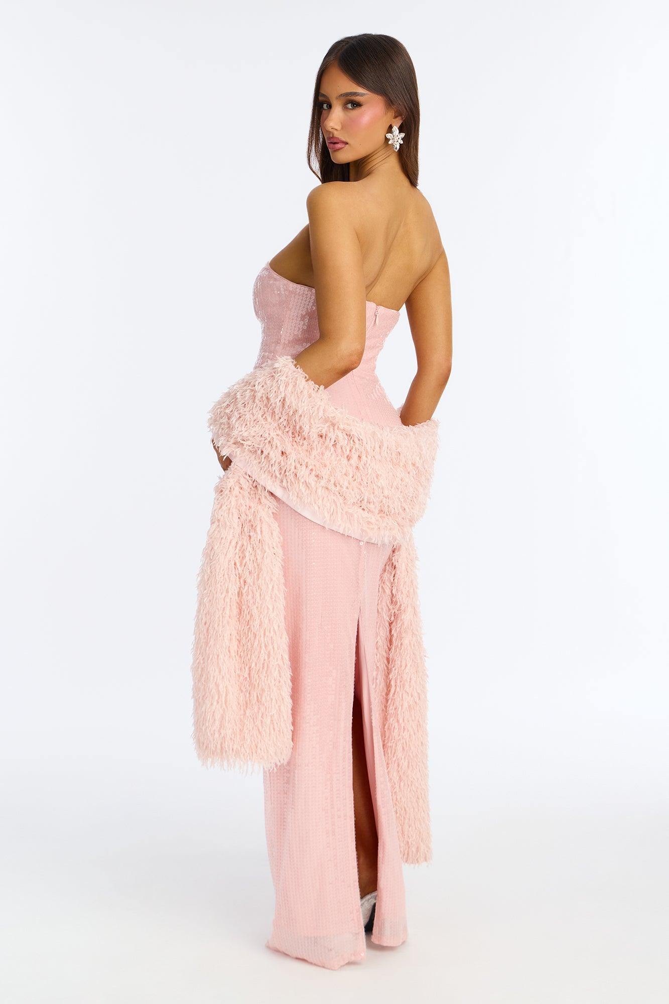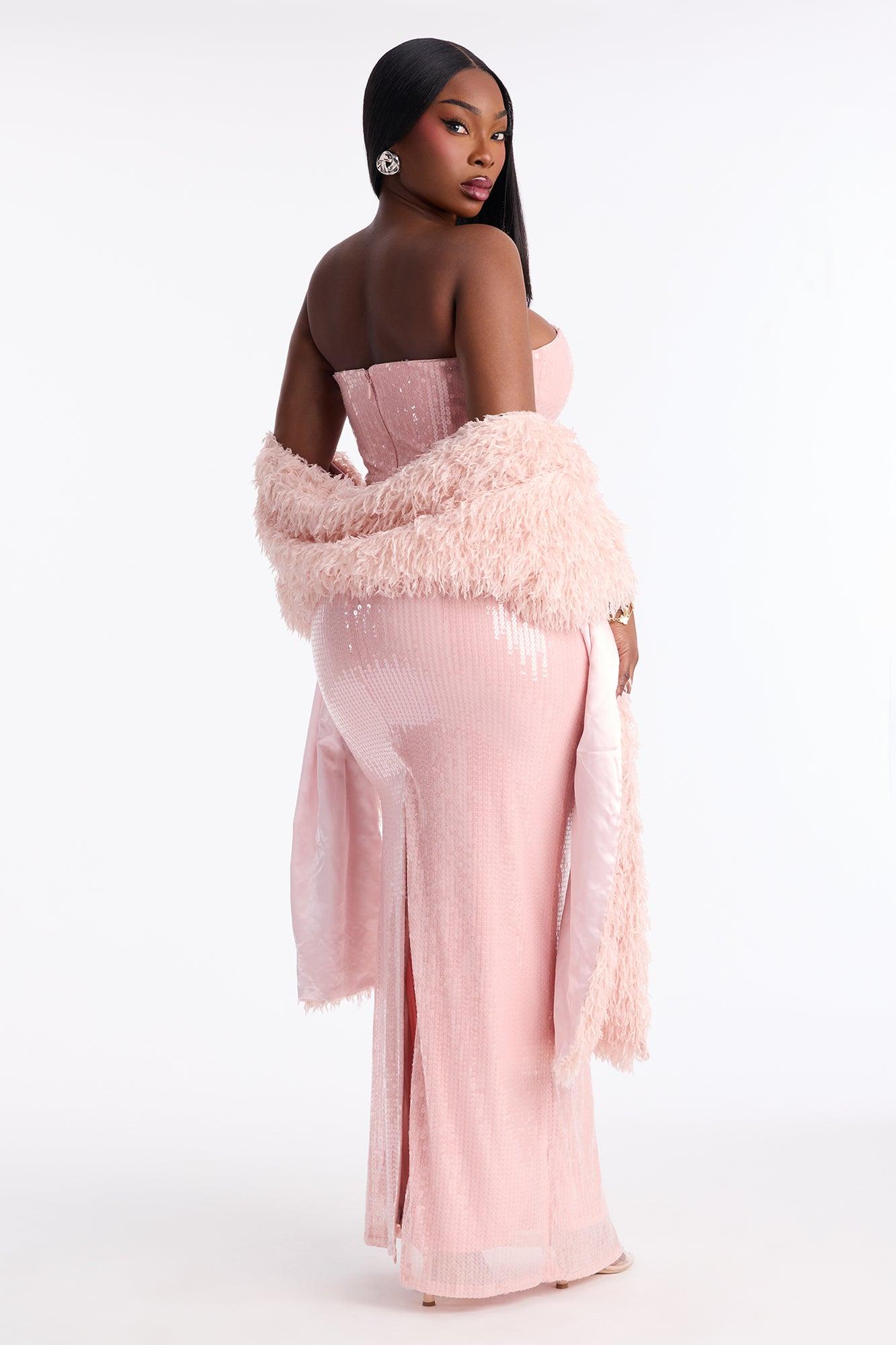 Available In Black And Pink. 2 Piece Shall And Gown Set Feathered Shall Satin Lined Non Stretch Sequin Gown Strapless/Wired V- Neckline/Back Slit Padded Bra Cups Hidden Back Zipper Closure Stretch Dress Self : 95% Polyester 5% Spandex Dress & Shall Lining : 100% Polyester Shall Self : 100% Polyester California Proposition 65WARNING: Cancer and Reproductive Harm - www.P65Warnings.ca.gov.