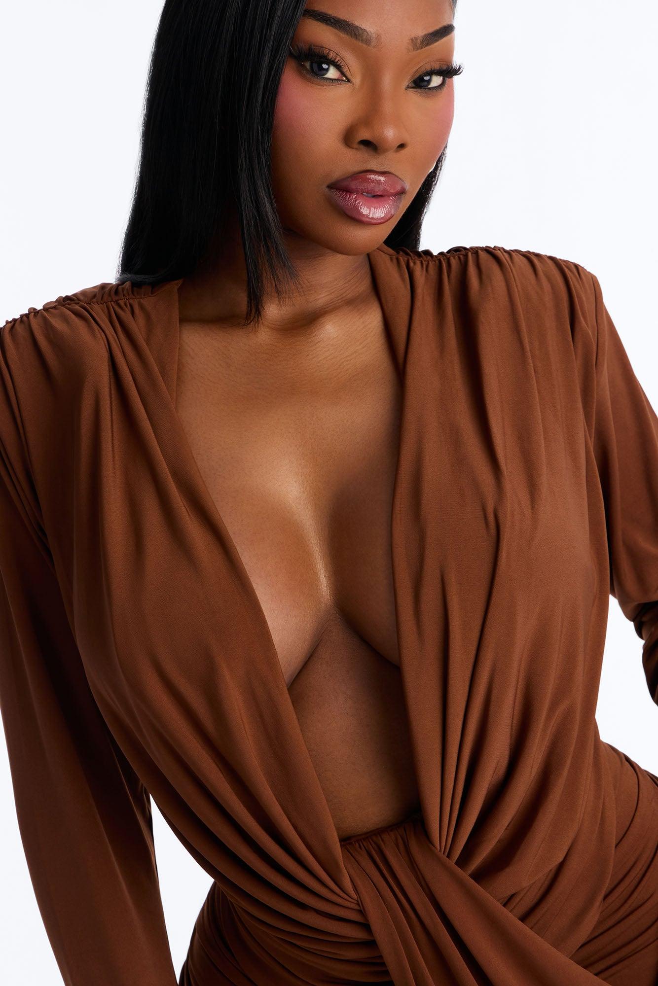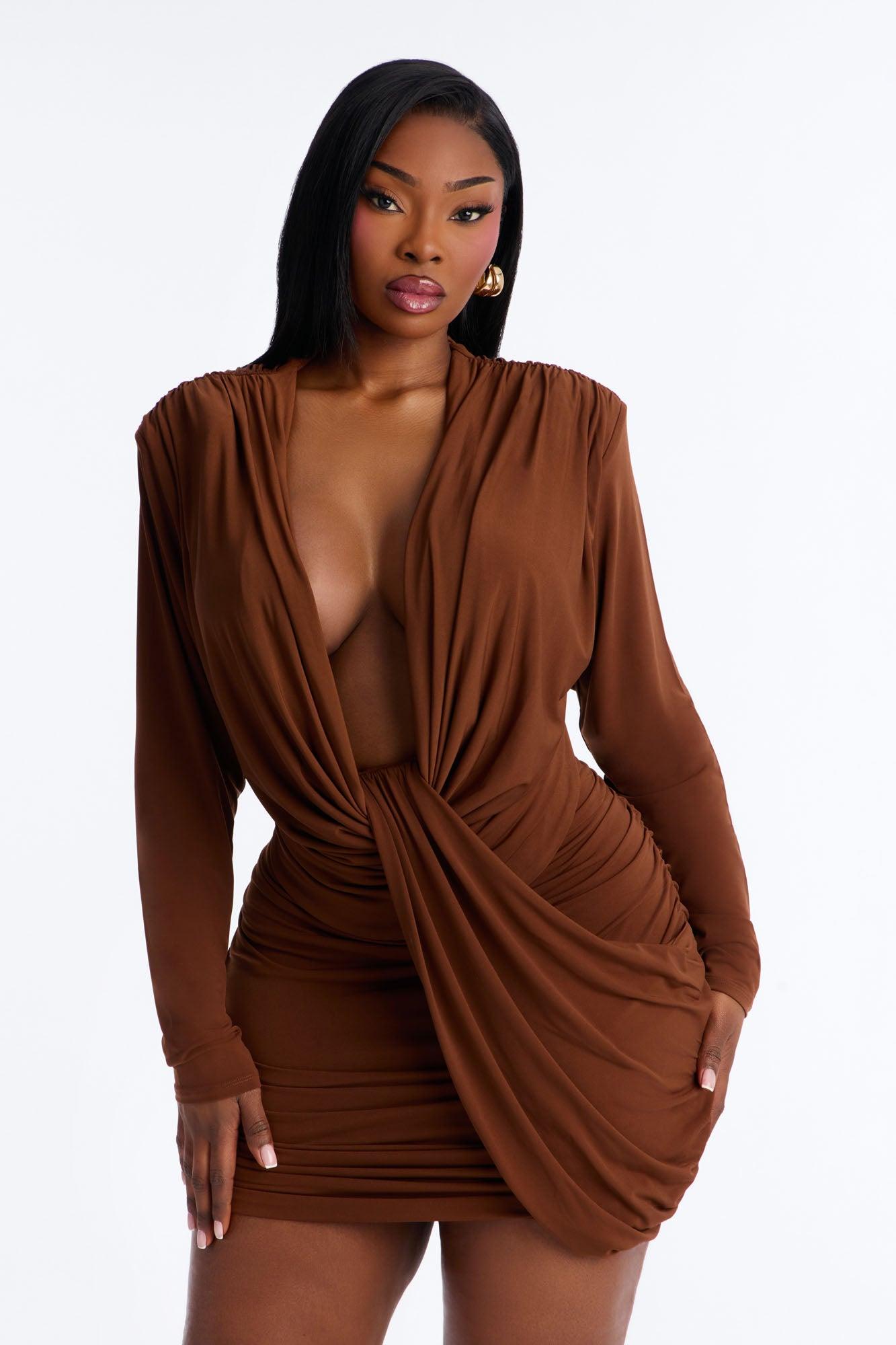 Available In Black And Brown. Long Sleeve Mini Dress Plunge Neckline Drape Detail Stretch Jersey Self: 95% Polyester 5% Spandex Lining: 95% Polyester 5% Spandex Imported