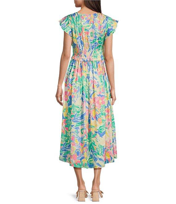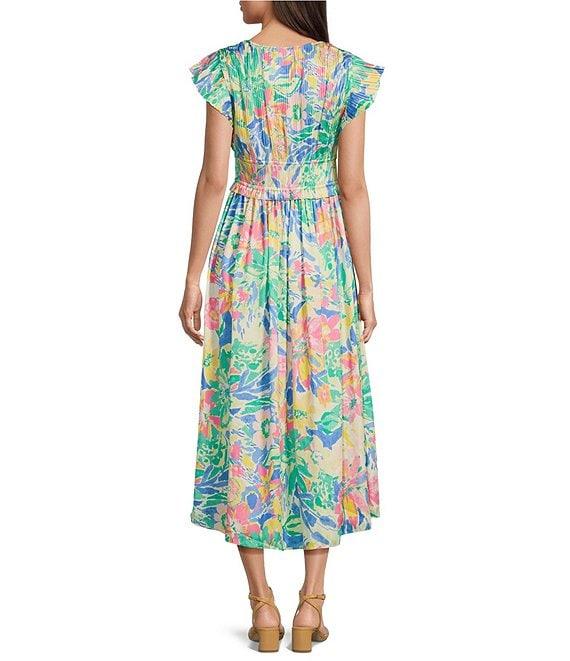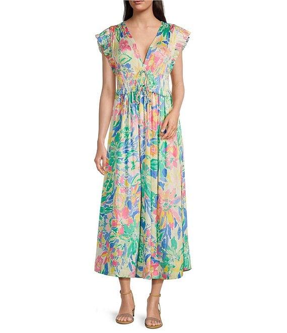 From Current Air, this dress features:Floral printA-line silhouetteV-necklineFlutter cap sleevesElasticized waistAdjustable waist tiePleated detailPullover constructionStraight hemlineApprox. 51" lengthPolyesterMachine wash cold/line dryImported.