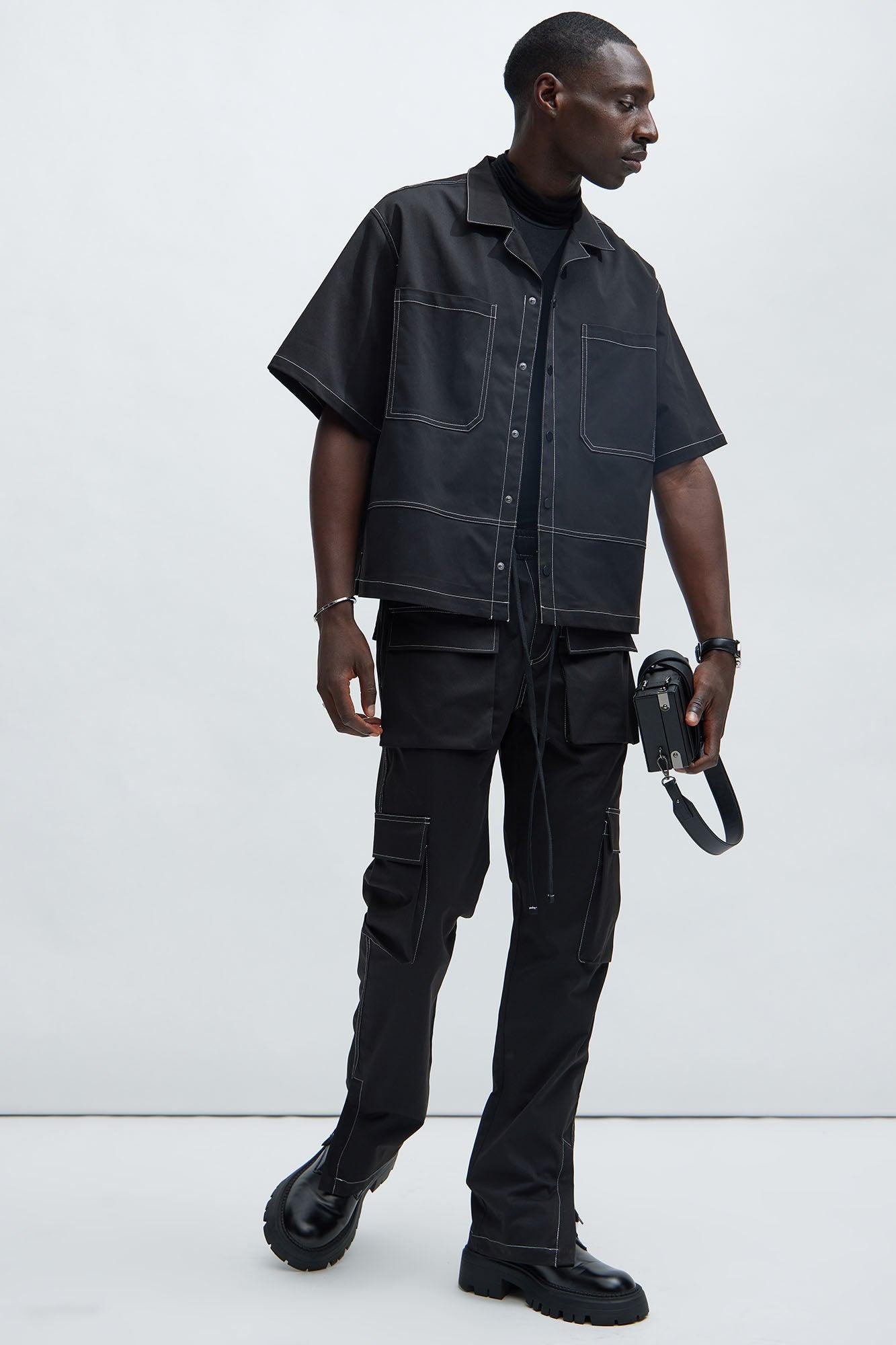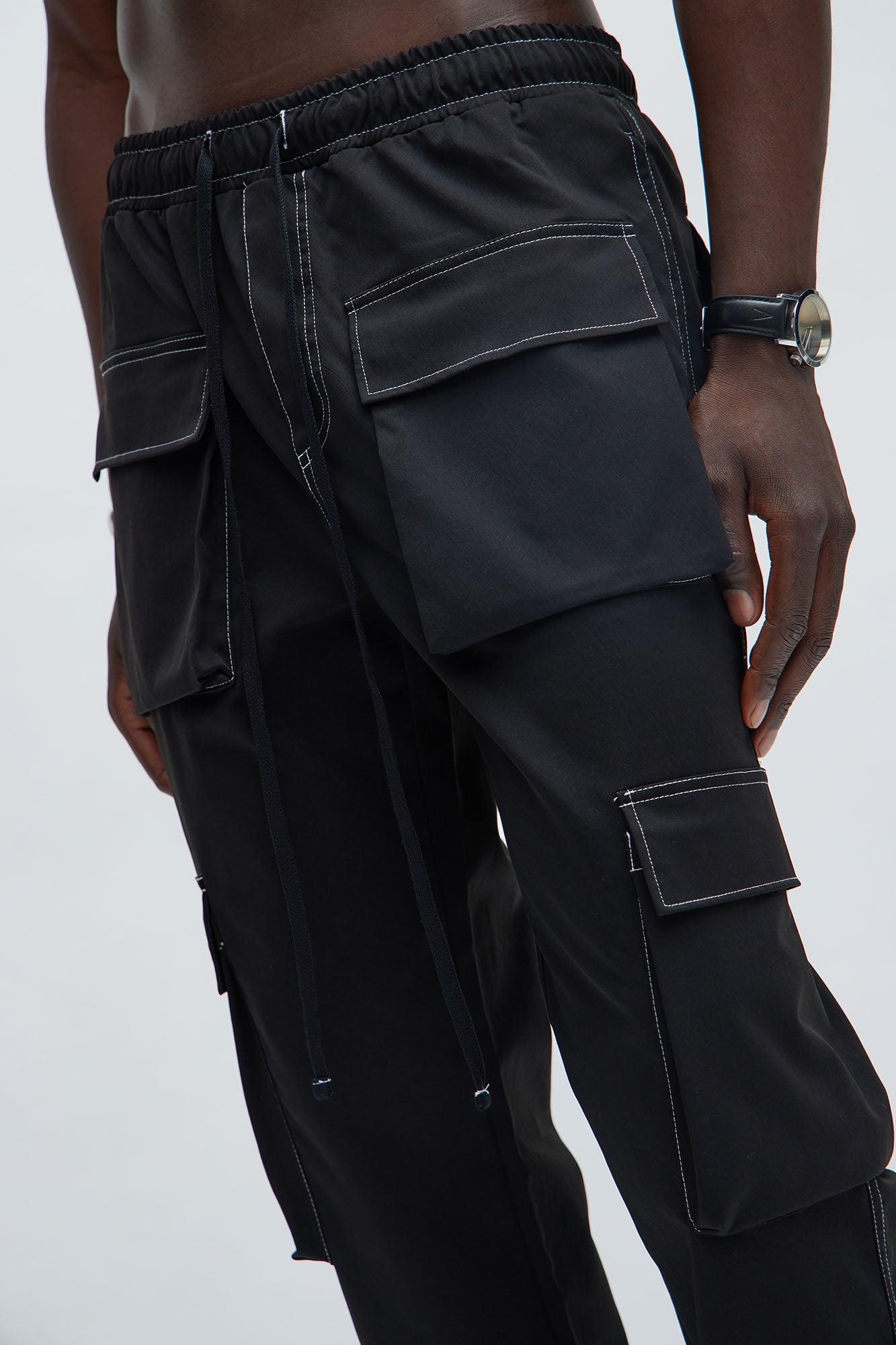 Available In Black. Elastic Waist Drawstring Snap Buttons On Hem Cargo Pockets Pair With "Curtis Contrast Stitch Cropped Shirt" Shell: 100% Polyester Imported California Proposition 65 WARNING: Cancer and Reproductive Harm - www.P65Warnings.ca.gov.