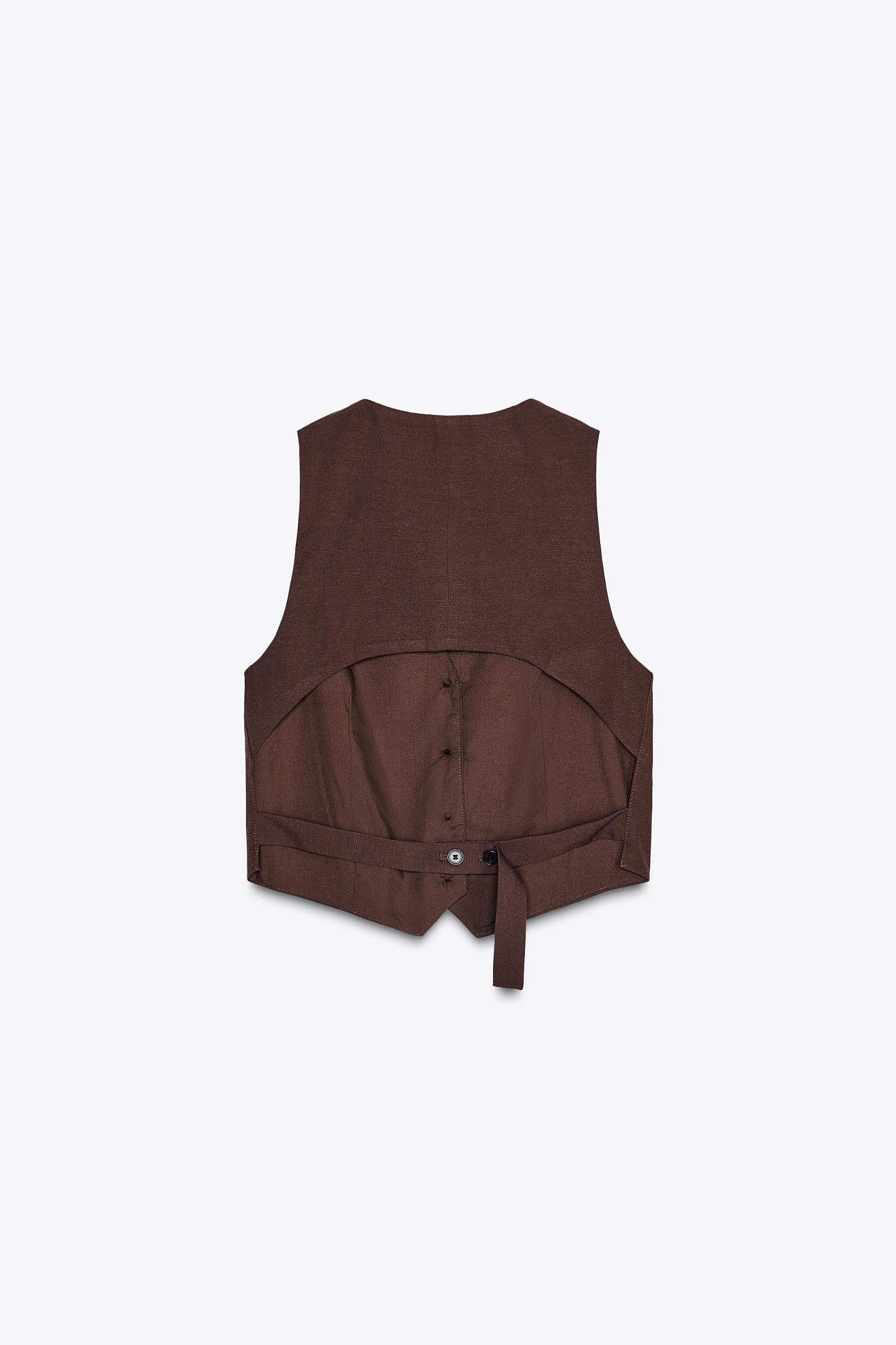 Vest made with 22% linen yarn. V-neck and sleeveless. Back vent and adjustable strap detail. Front button closure.