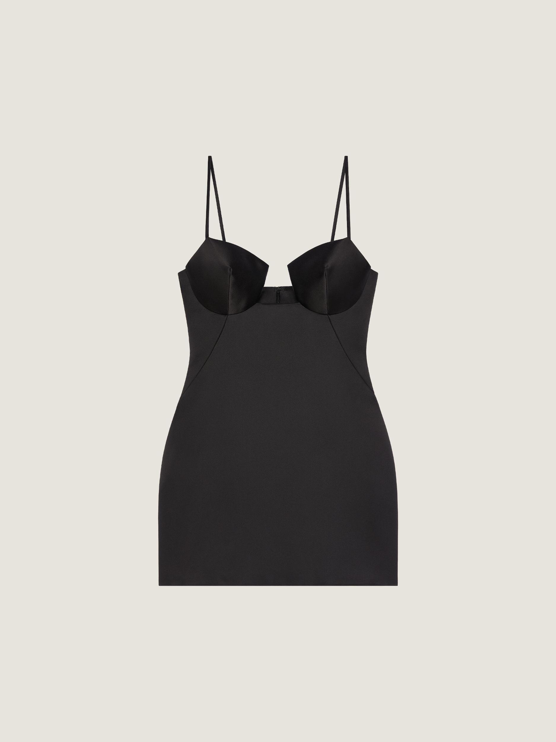 Femininity and elegance are expressed in leather and pearl embroidery, with bras worn under jackets and cutaway details appearing in tailoring, dresses and knitwear. Cutaway bras are integrated into garments to reveal the body, exploring the interplay of dress and undress. Mini dress in silk satin duchesse. Cutaway bra detail. Sculpted silhouette on the hips. Thin adjustable straps. Invisible zipped closure on the back. Two side pockets. Model measures 5.8 Feet and wears a size 36.