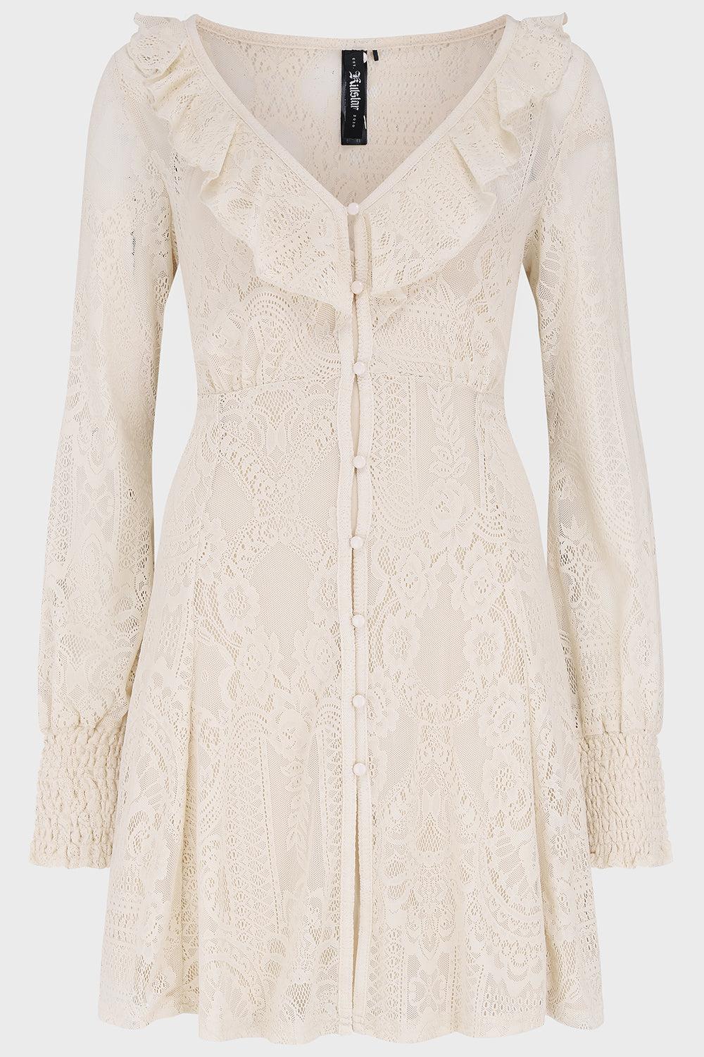 CYBELE LACE- Luxe, slight stretch custom lace.- Long fitted sleeves with exaggerated elasticated cuff and ruffle hem.- V-neckline with exaggerated ruffle collar.- Functional front button fastening.- Underbust seam with gathering.- Designed in Brighton, England.Model is 5'8 and wears a size XS.With KILLSTAR branding, 100% Polyamide.Hand wash delicate (30°c) / Do not bleach / Do not tumble dry /Iron at low temperatures / Do not dry clean. Imported.BelladonnaWe've reimagined our iconic KILLSTAR Belladonna lace with a new twist — now with added stretch for an even more flattering fit. Sumptuous black, warm ivory, and decadent plum lace weave together in hauntingly beautiful silhouettes that echo timeless gothic romance. Complete the look with bold statement belts and custom-designed accessories, crafted to elevate every ensemble into something unforgettable.
