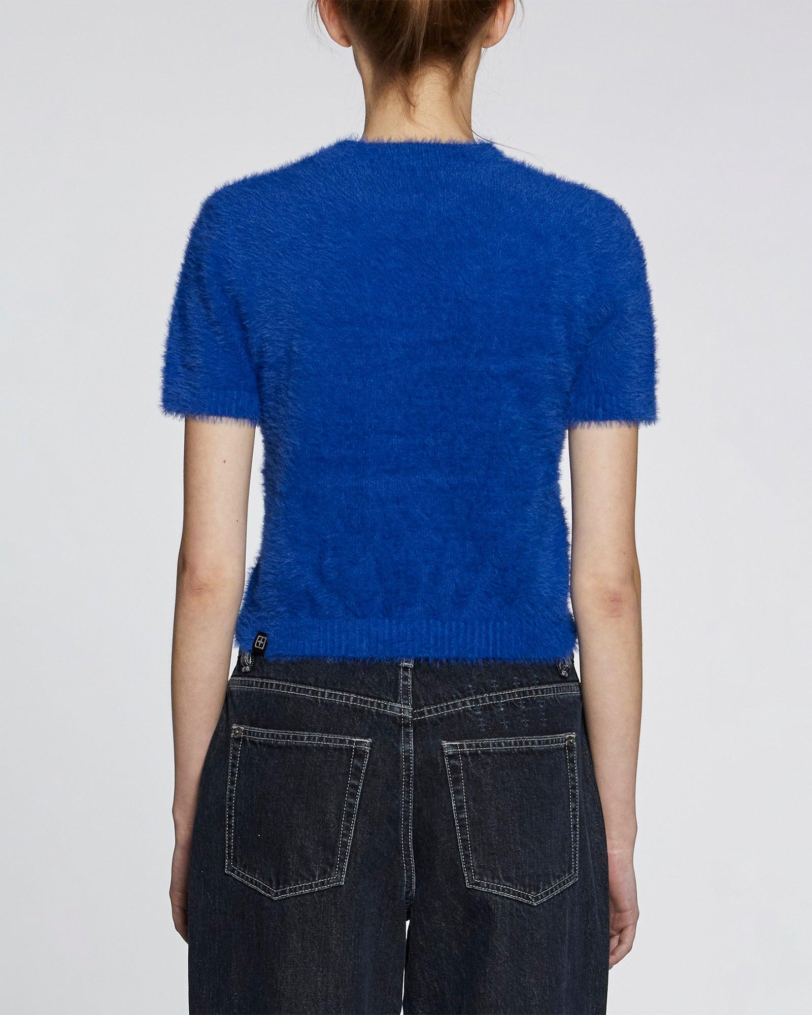 Fully fashioned SS cropped knit top made from premium fuzzy textured yarn in cobalt. It features Ksubi branding. Wear back with the Super x Mini Cobalt or the Low Rider Side Stripe.