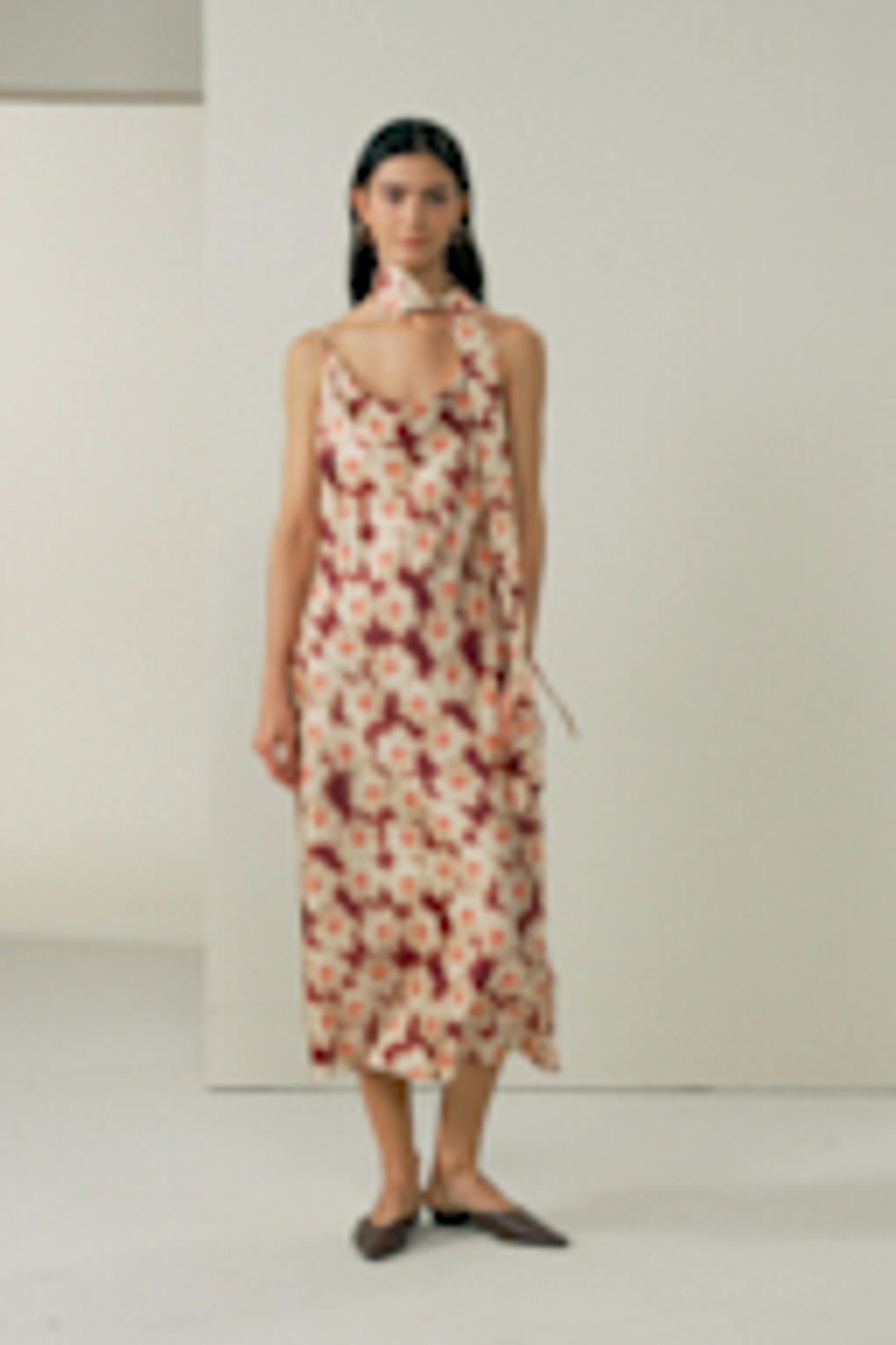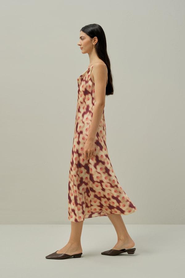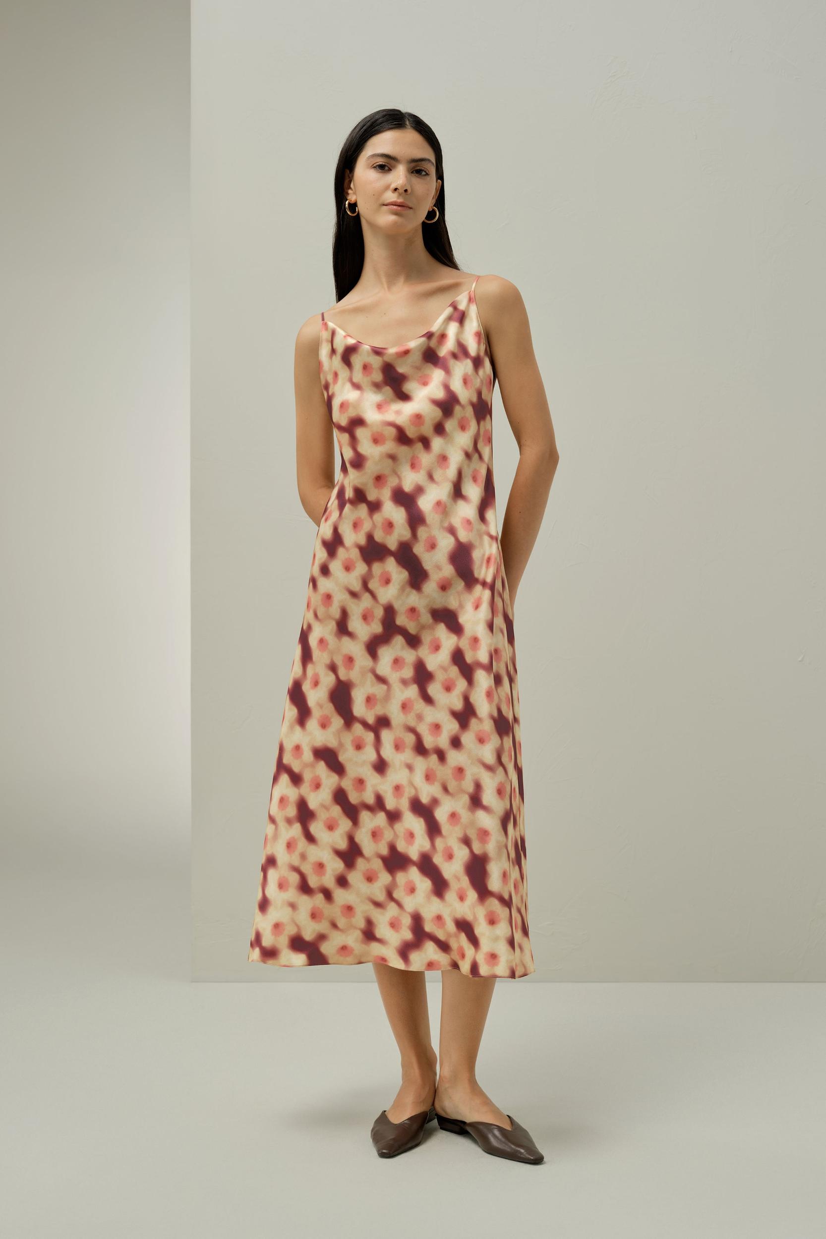 Discover the "Elegant Draped" Silk Charmeuse Slip Dress, featuring a delicate cowl neckline, and a bias-cut design that flatters your figure. Perfect for parties and weekends, this dress combines elegance with a playful print for the look.