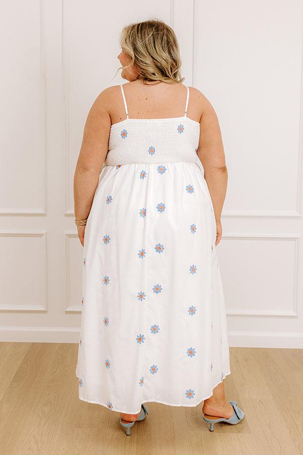 - Embrace your inner flower child with this cute maxi dress! With an embroidered flower design and a flowy fit, it's perfect for twirling through your day in style. - Fully lined material with an embroidered flower design featuring orange and a blue hue - A sweetheart cut neckline with gathered detailing - Adjustable spaghetti straps - A bodice with a smocked back and a cut out accent on the front - A waistline with an elastic back - Hidden side pockets - A flowy silhouette that ends in a maxi length hemline