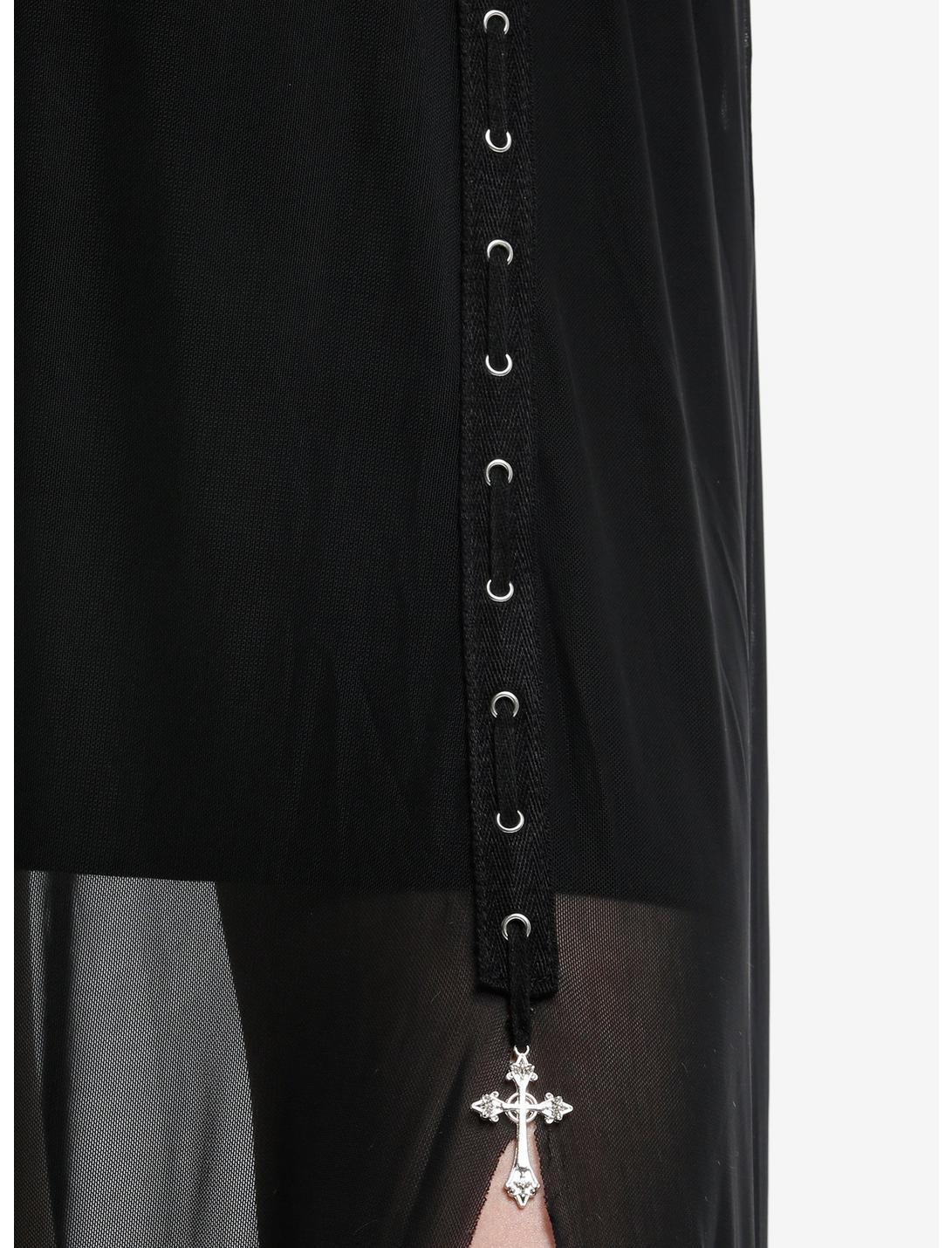 This moody maxi skirt is semi-sheer thanks to its black mesh fabrication. It has grommet taping down the thighs ending in high slits, and the slits have gothic cross charms at the top. Elasticated waistband and mini-length lining.88% polyester; 12% elasticWash cold; dry lowLength: 36"ImportedListed in junior sizesModel is 5'10"Model wears size Small