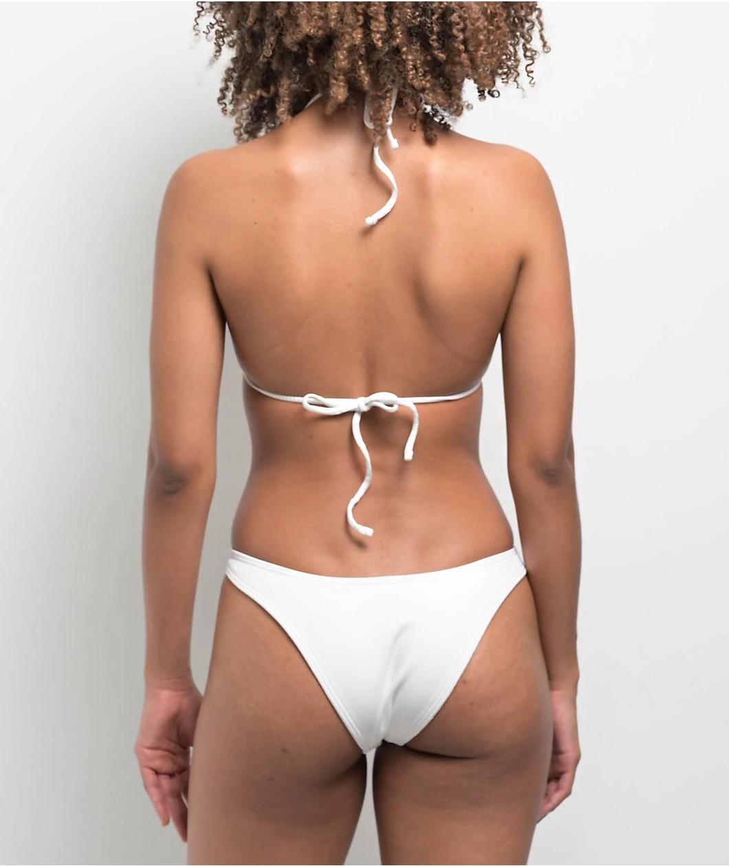 Damsel presents the Chanel high leg bikini bottom in a white ribbed design for a classic look, with Heart-shaped rings at the hips for a cute touch. Ideal for tanning or going in the water, the swimsuit bottom offers a lined construction for comfort.
